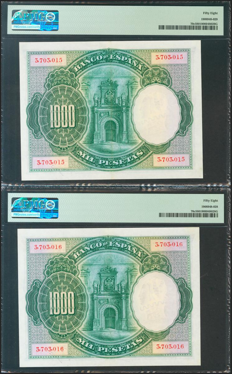 1000 Pesetas. 1 de Julio de 1925. Pareja correlativa. Sin serie y numeración posterior al 3646000. (Edifil 2021: 351, Pick: 70c). Inusual en esta calidad. EBC++. Encapsulado PMG58, ambos.