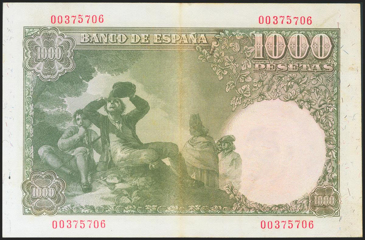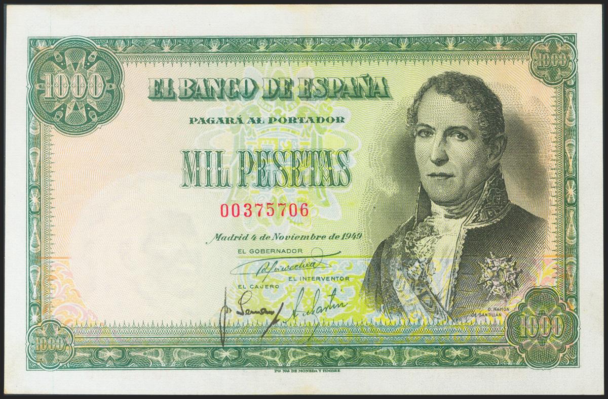 1000 Pesetas. 4 de Noviembre de 1949. Sin serie. (Edifil 2021: 458). Doblez vertical que no llega a romper la fibra, presentando gran parte del apresto original. EBC.