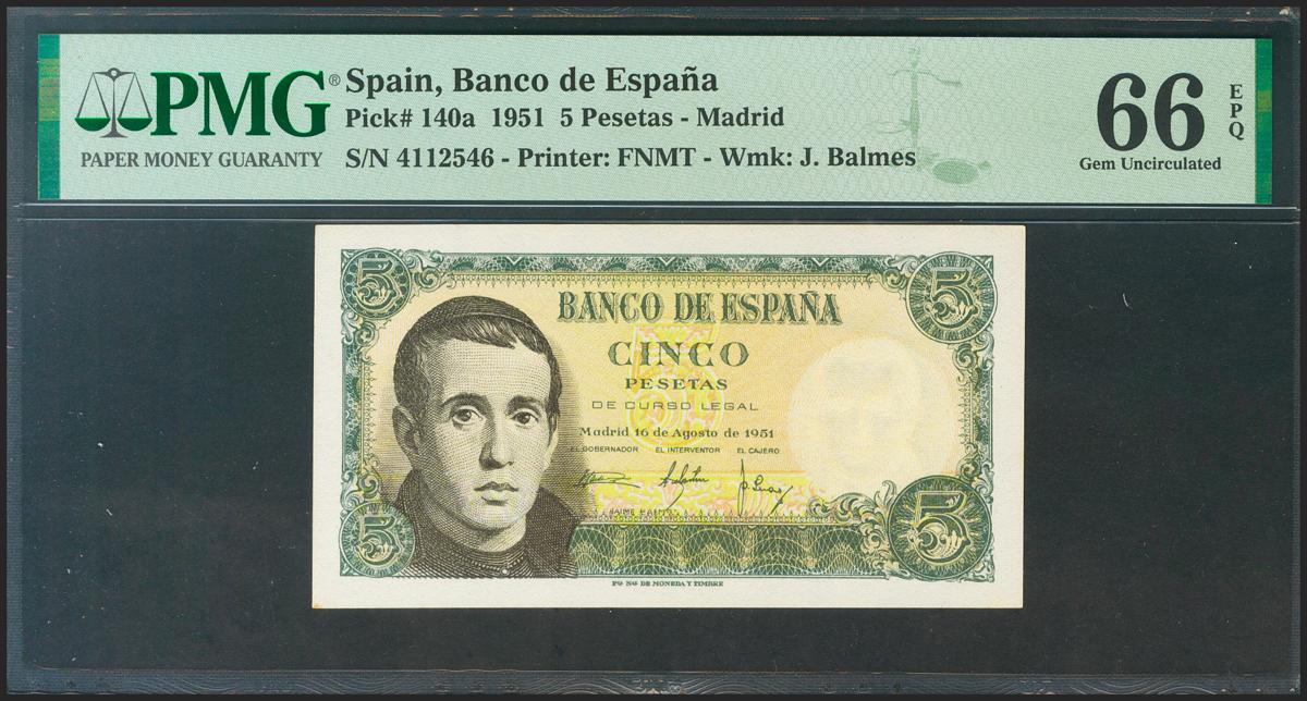 5 Pesetas. 16 de Agosto de 1951. Sin serie. (Edifil 2021: 459, Pick: 140a). Raro en esta calidad, apresto original. SC. Encapsulado PMG66EPQ.
