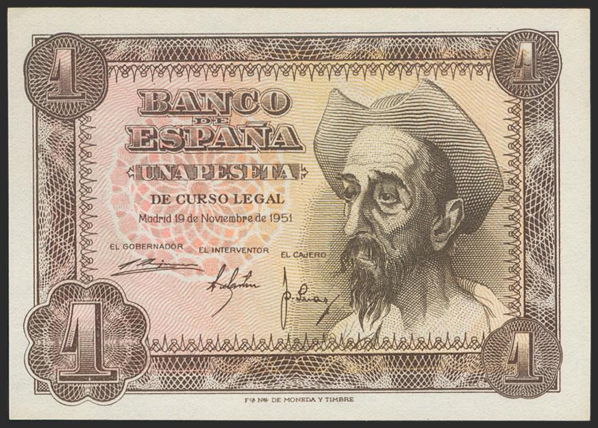 1 Peseta. 19 de Noviembre de 1951. Sin serie. (Edifil 2021: 461). Conserva gran parte del apresto original. EBC+.
