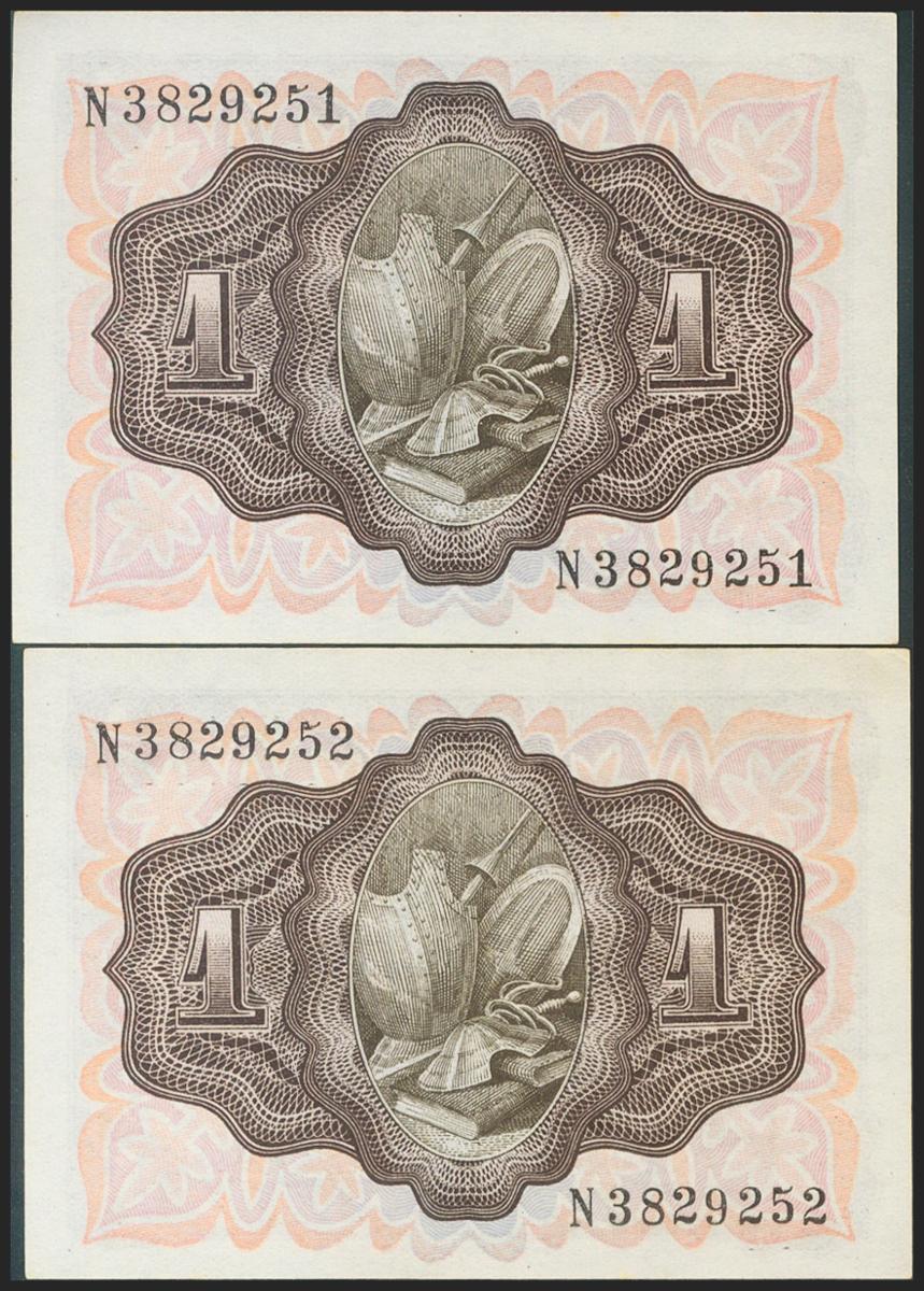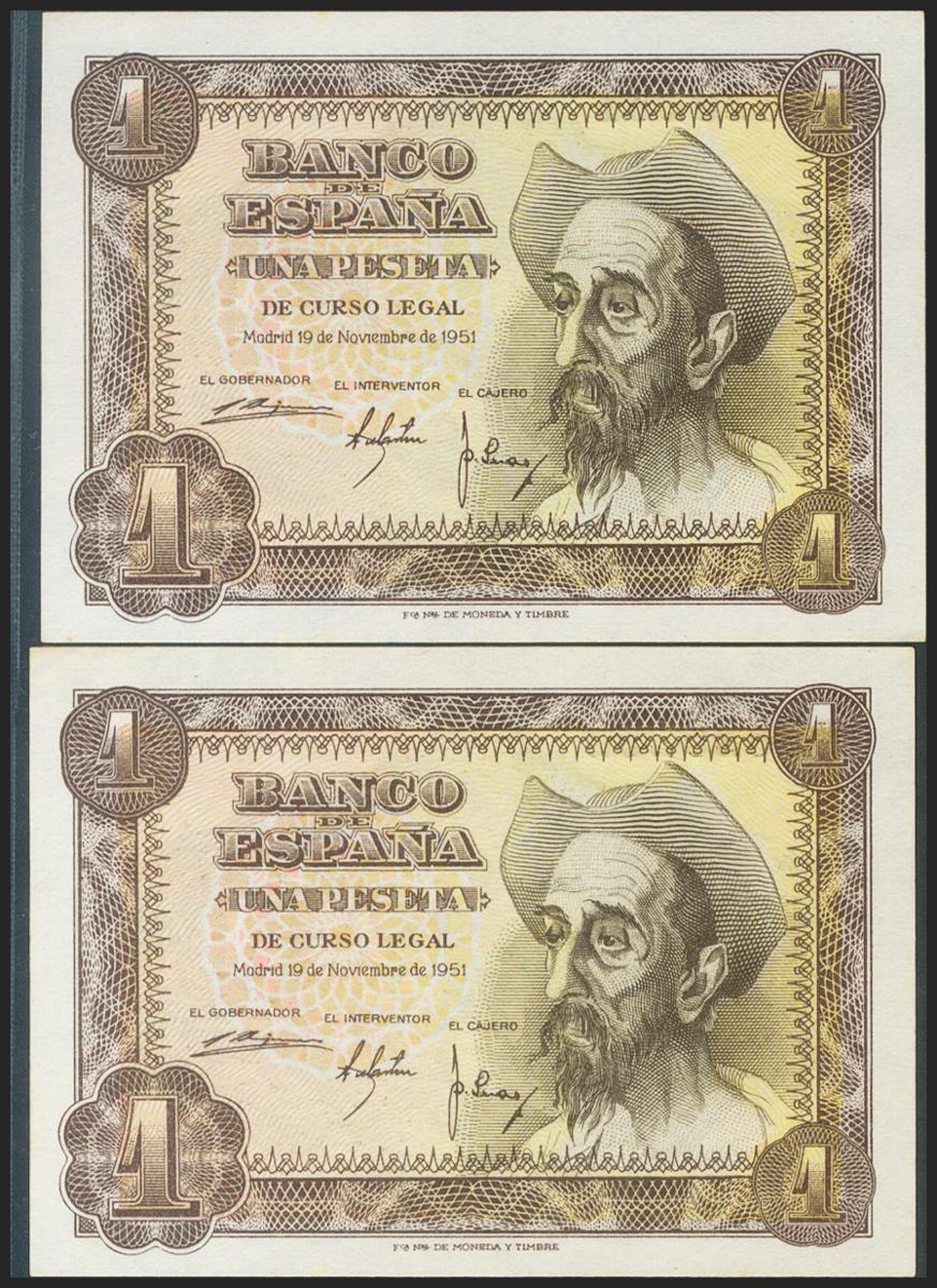 1 Peseta. 19 de Noviembre de 1951. Pareja correlativa. Serie N. (Edifil 2021: 461a). Conserva todo su apresto original. SC/SC-.