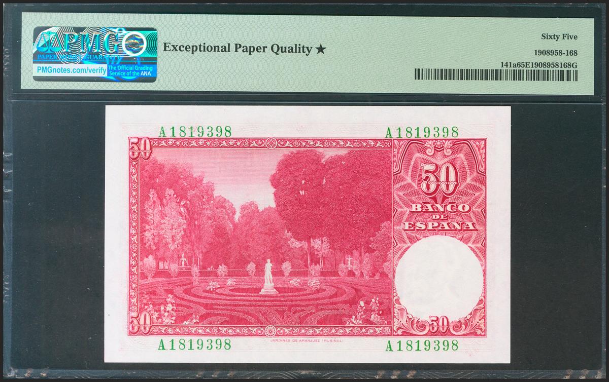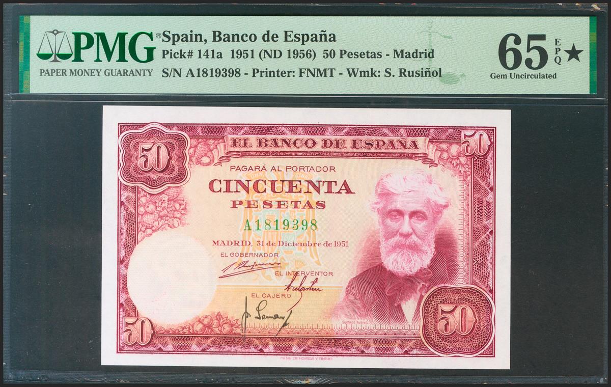 50 Pesetas. 31 de Diciembre de 1951. Serie A. (Edifil 2021: 462a, Pick: 141a). Rarísimo en esta calidad, apresto original. SC. Encapsulado PMG65EPQ*.