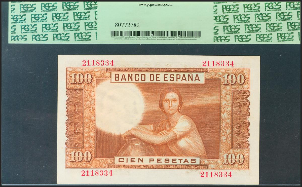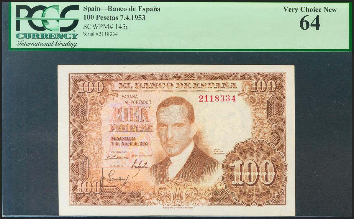 100 Pesetas. 7 de Abril de 1953. Sin serie. (Edifil 2021: 464). SC. Encapsulado PCGS64.