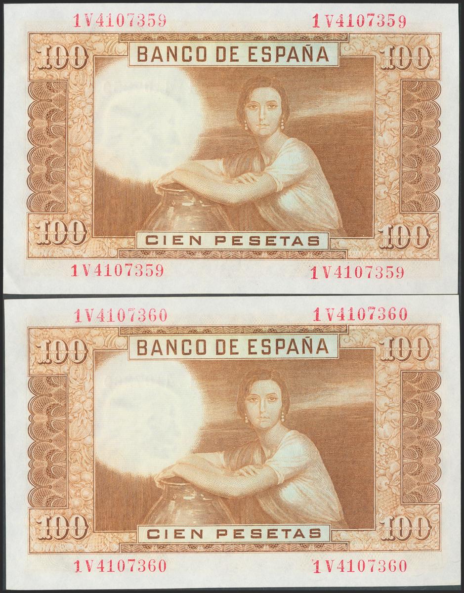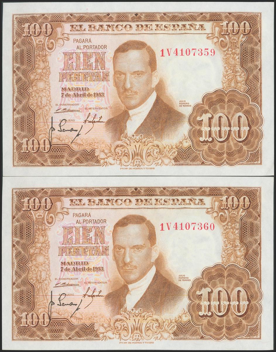 100 Pesetas. 7 de Abril de 1953. Pareja correlativa. Serie 1V. (Edifil 2017: 464c). Apresto original. SC/EBC+.