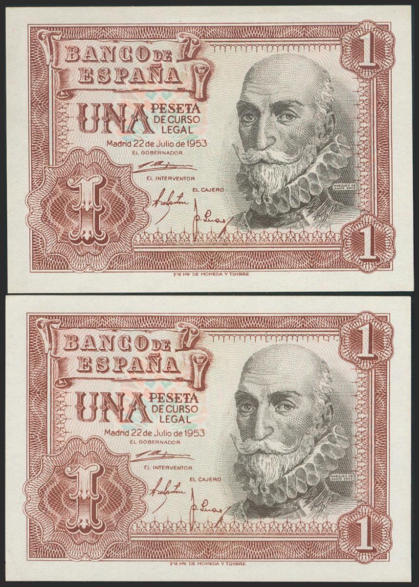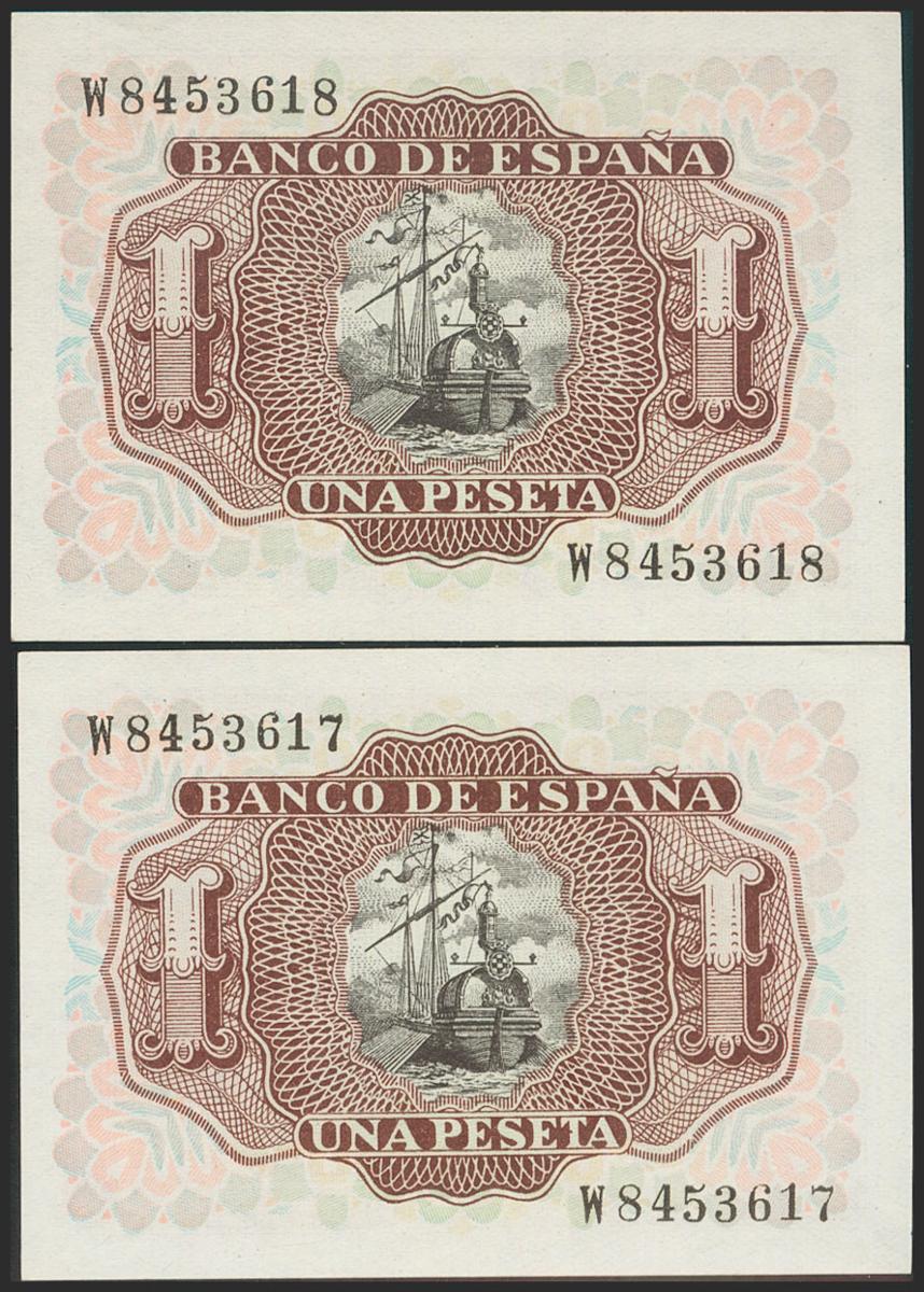 1 Peseta. 22 de Julio de 1953. Pareja correlativa. Serie W. (Edifil 2021: 465a). Apresto original. SC.
