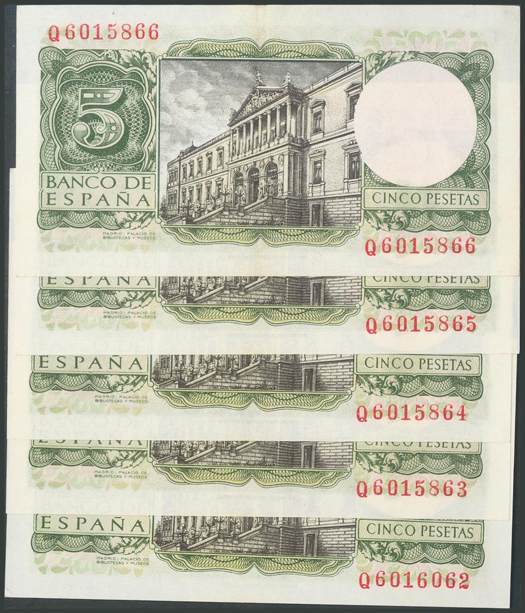 5 Pesetas. 22 de Julio de 1954. 5 billetes correlativos. Serie Q. (Edifil 2017: 466a). SC/EBC+.