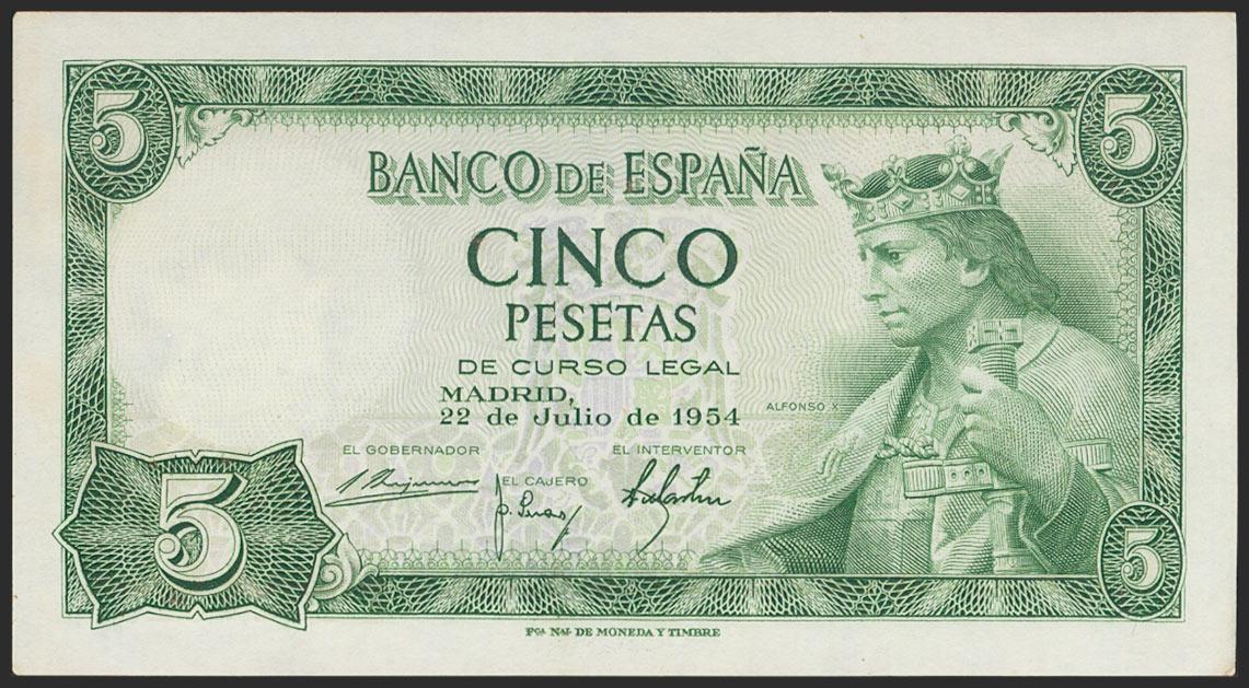 5 Pesetas. 22 de Julio de 1954. Serie T. (Edifil 2021: 466a). Apresto original. SC.