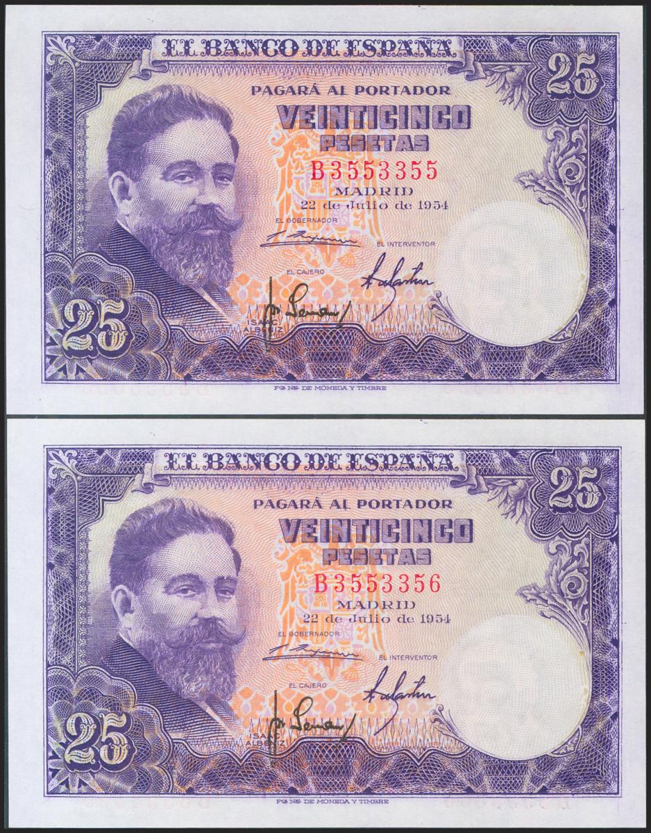 25 Pesetas. 22 de Julio de 1954. Pareja correlativa. Serie B. (Edifil 2017: 467a). SC.