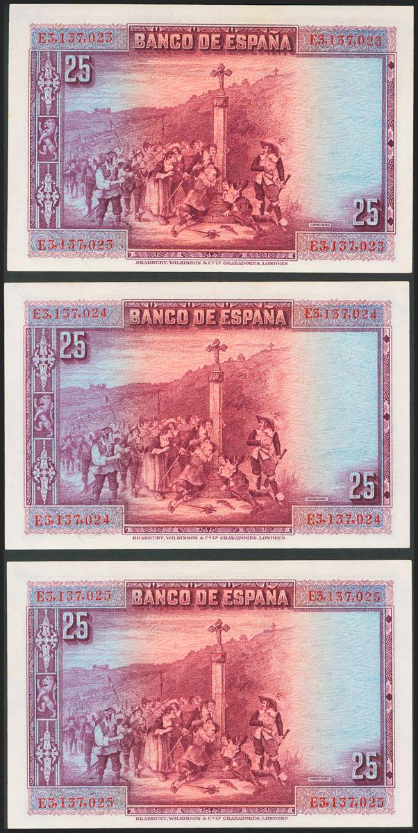 25 Pesetas. 15 de Agosto de 1928. Trío correlativo. Serie E. (Edifil 2021: 353). Conserva todo su apresto original. SC-.