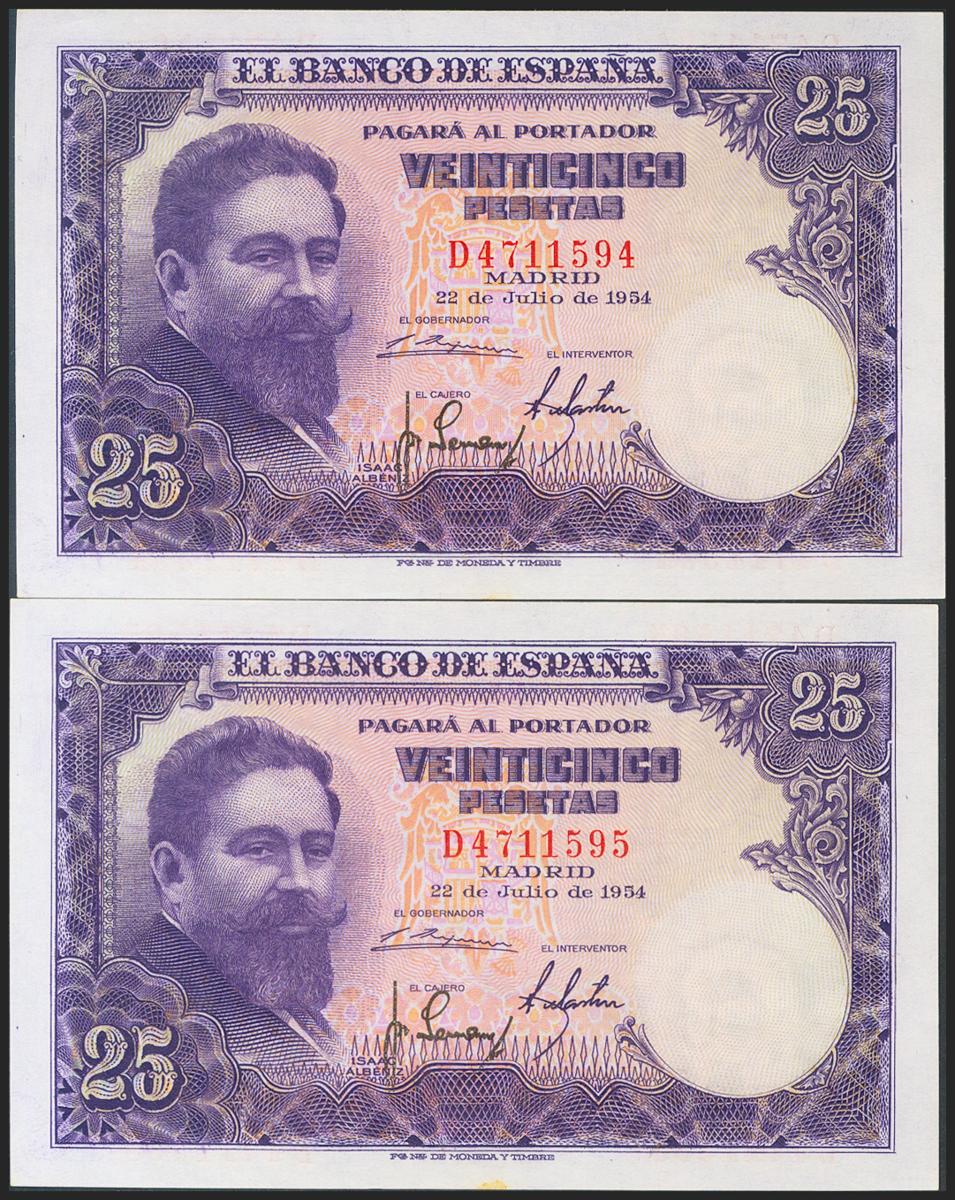 25 Pesetas. 22 de Julio de 1954. Pareja correlativa. Serie D. (Edifil 2021: 467a). Apresto original, manchita de óxido en el margen inferior. SC-.