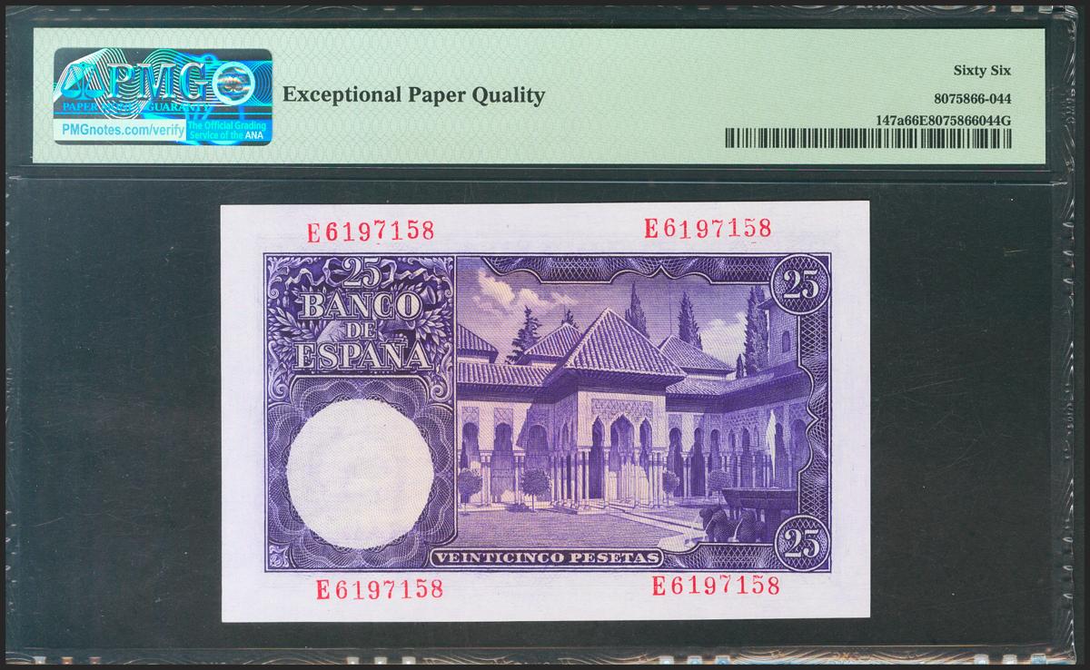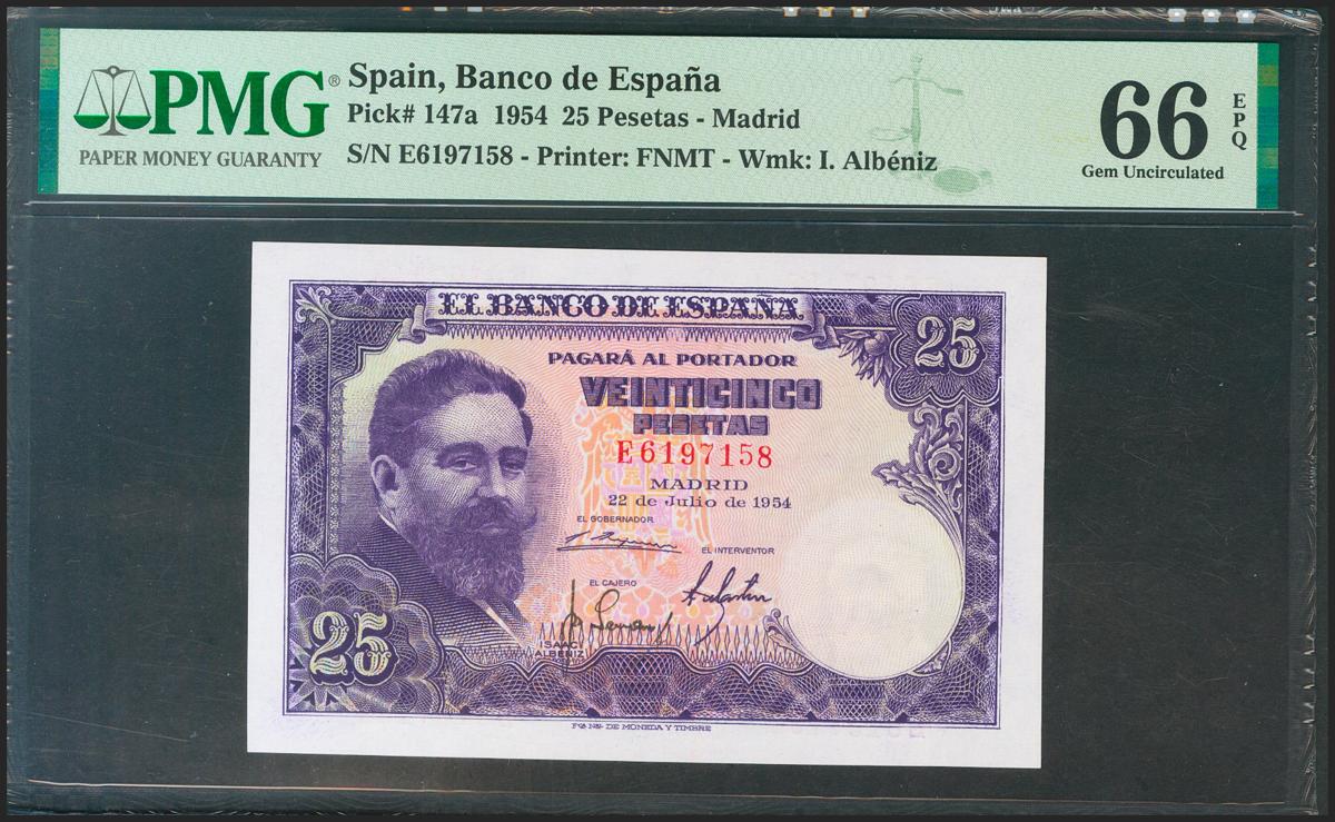 25 Pesetas. 22 de Julio de 1954. Serie E. (Edifil 2021: 467a). Apresto original. SC. Encapsulado PMG66EPQ.