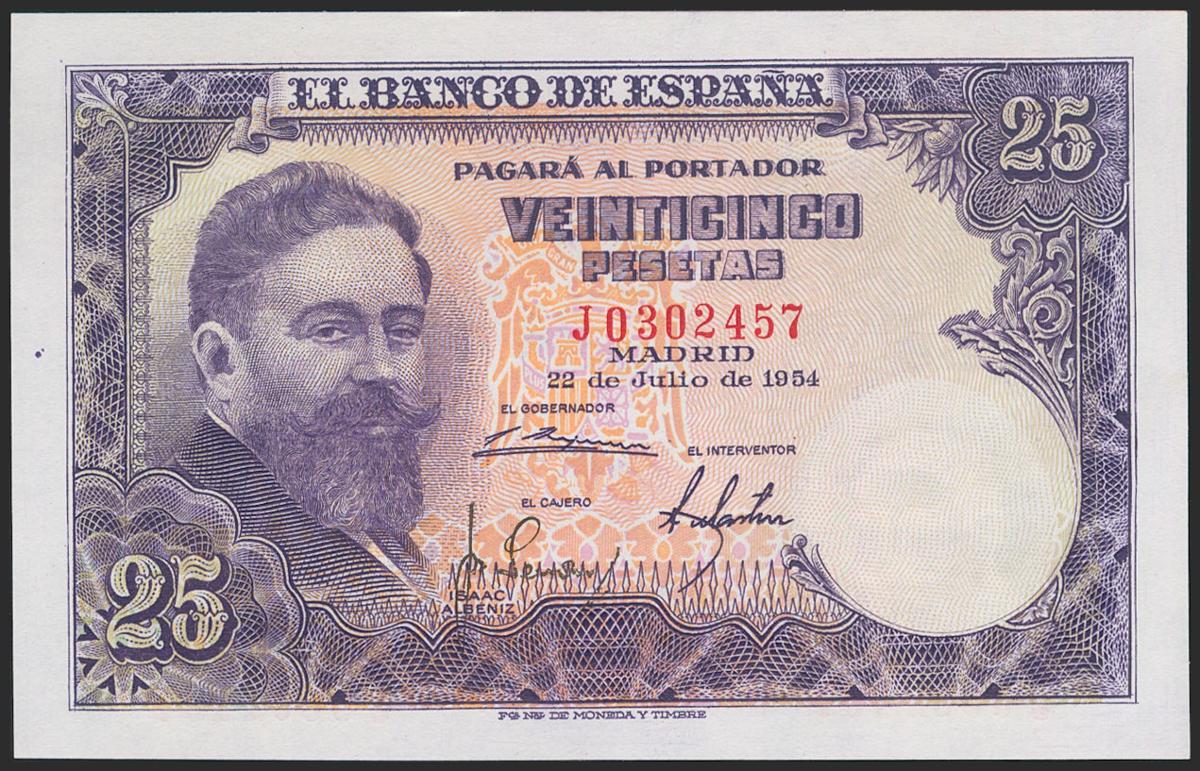 25 Pesetas. 22 de Julio de 1954. Serie J. (Edifil 2021: 467a). Apresto original. SC.