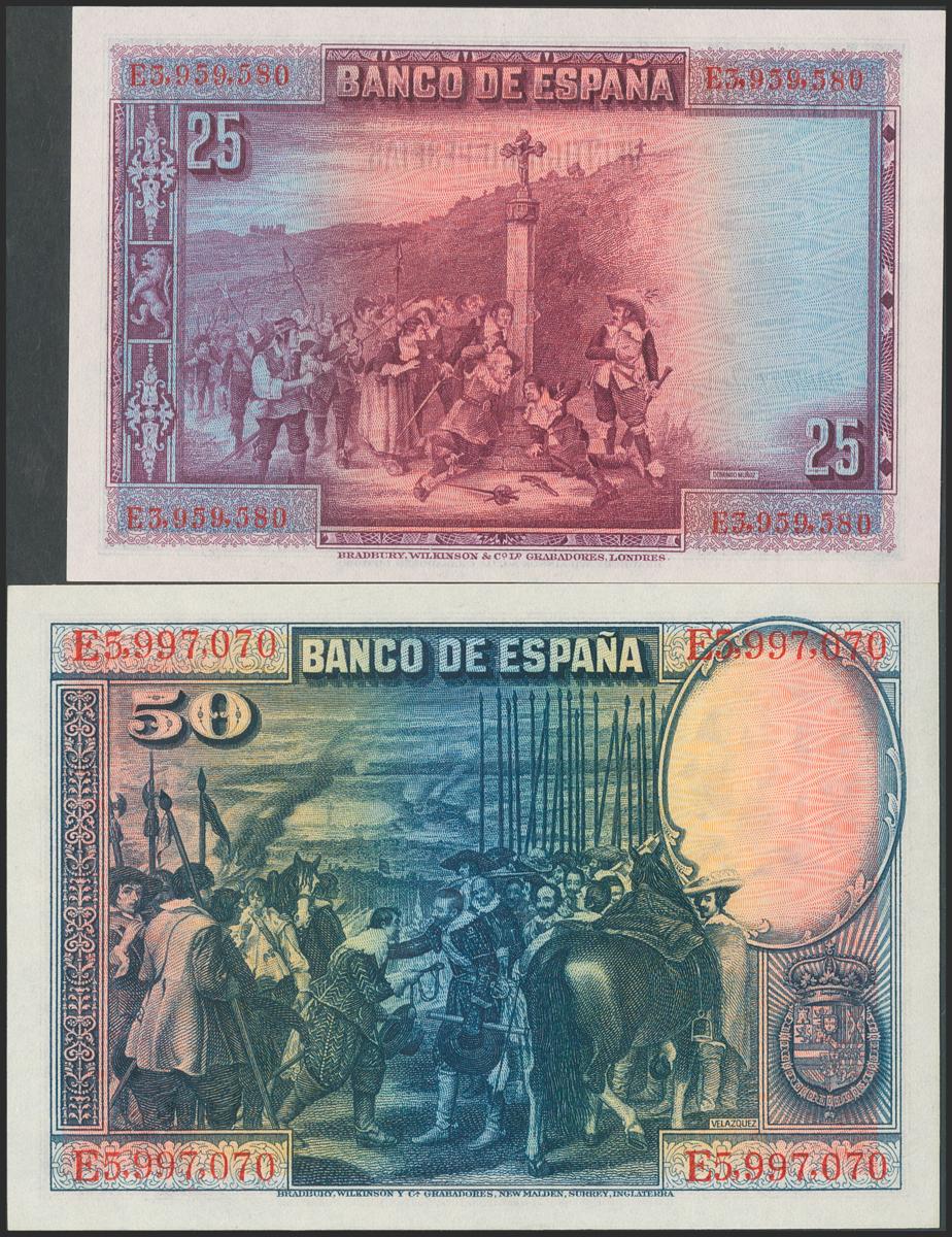 Conjunto de 2 billetes de 25 Pesetas y 50 Pesetas, emitidos el 15 de Agosto de 1928, ambos con la serie E. (Edifil 2021: 353, 354). Apresto original. SC.