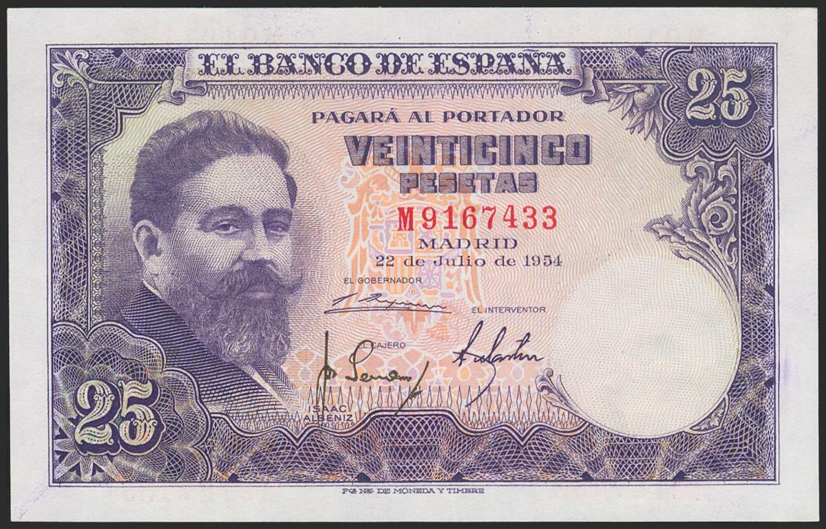 25 Pesetas. 22 de Julio de 1954. Serie M. (Edifil 2021: 467a). Apresto original. SC.
