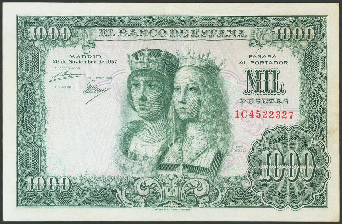 1000 Pesetas. 29 de Noviembre de 1957. Serie 1C. Error de impresión: firma del cajero en el reverso. (Edifil 2017: 469b, variedad no catalogada). Conserva parte del apresto original. EBC-.