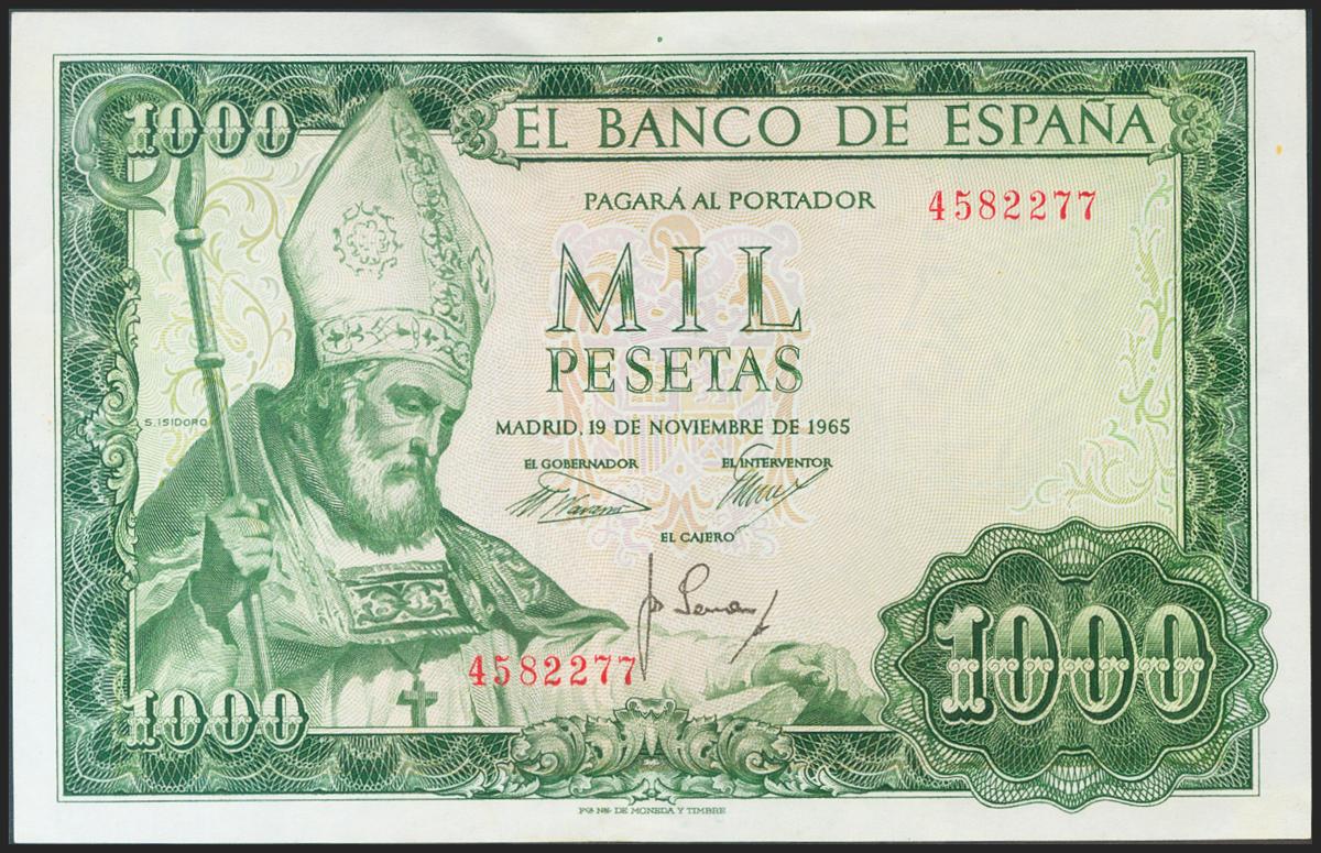 1000 Pesetas. 19 de Noviembre de 1965. Sin serie. (Edifil 2021: 471). Conserva parte de su apresto original. EBC.