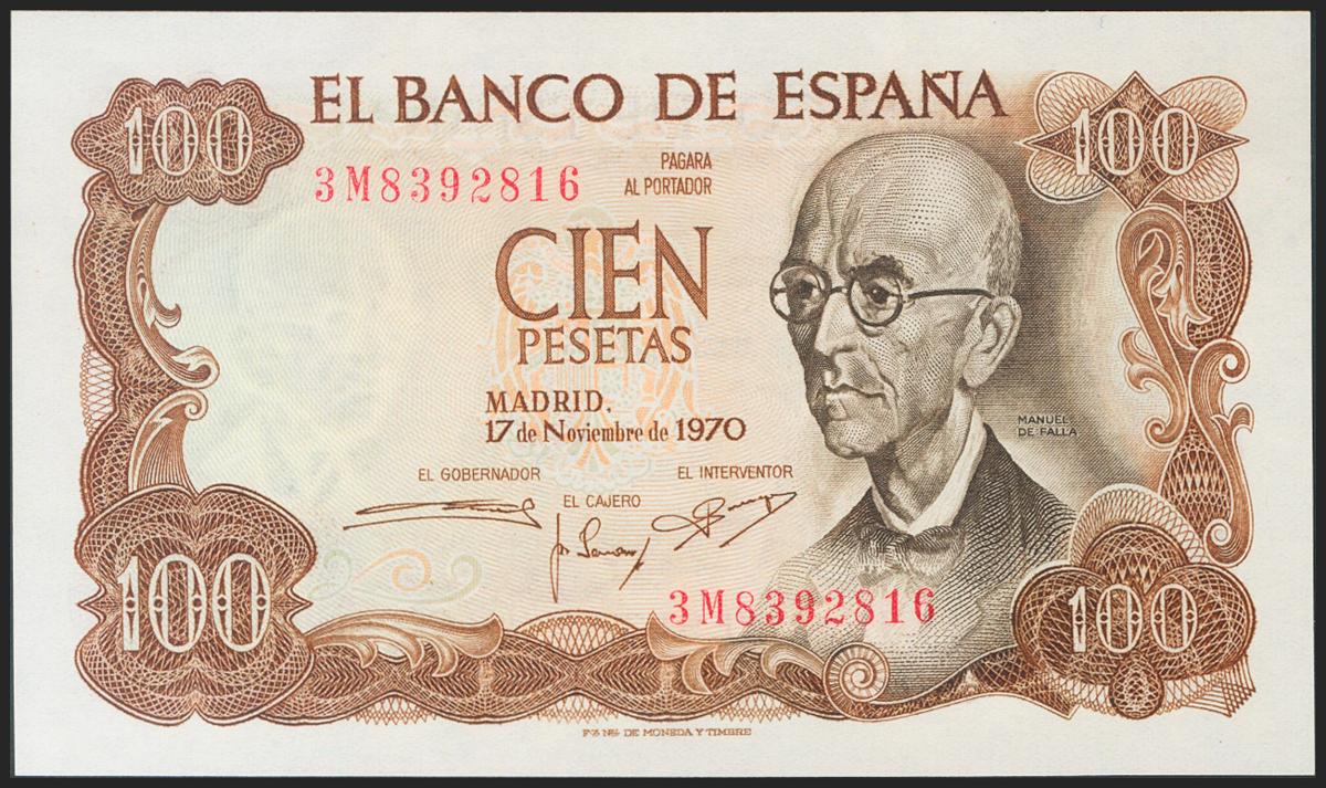 100 Pesetas. 17 de Noviembre de 1970. Serie 3M. (Edifil 2021: 472c). Apresto original, típica desviación de color verde en el anverso. SC-. (queremos resaltar que la desviación del color, procedente de alteración química o de oxidación de papel, continuamente nos encontramos este tipo de "pseudovariedad" en colecciones, ofrecemos este lote con el único ánimo de aportar información a nuestros pujadores y añadimos la expresión "a examinar", para avisar más aun si cabe a los posibles pujadores de las circunstancias que envuelven a este lote). A EXAMINAR.