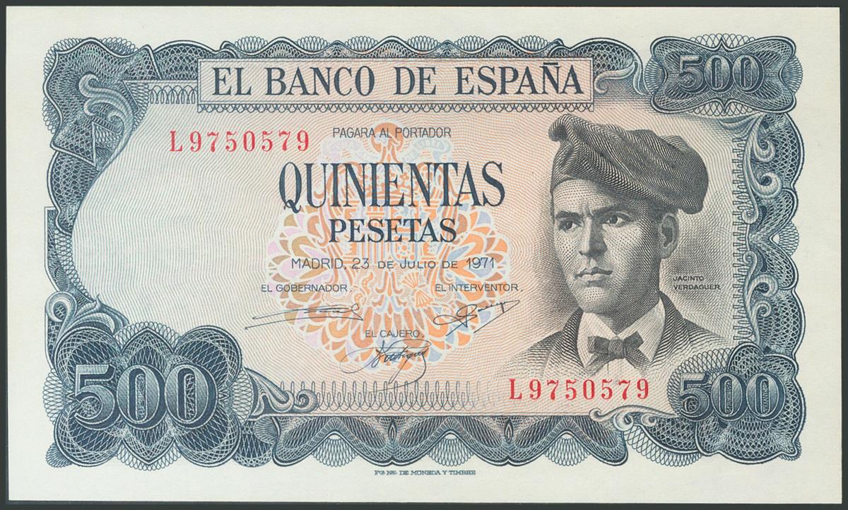 500 Pesetas. 23 de Julio de 1971. Serie L, capicúa. (Edifil 2017: 473a). Conserva todo su apresto original. EBC+.