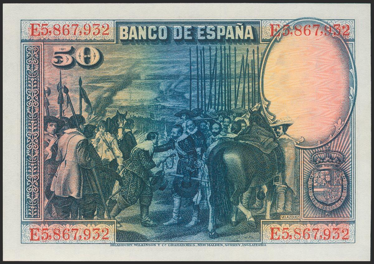 50 Pesetas. 15 de Agosto de 1928. Serie E. (Edifil 2021: 354). Apresto original. SC.