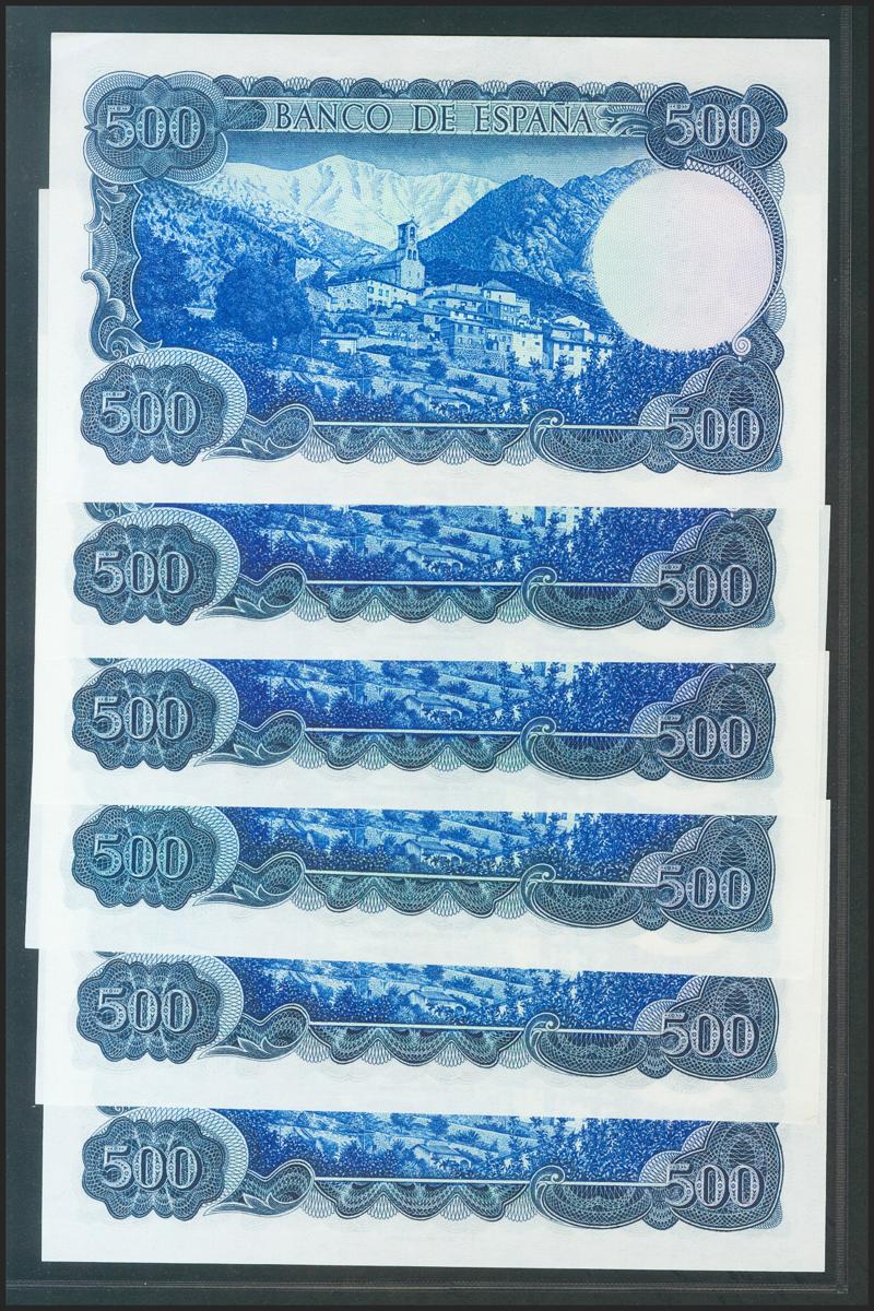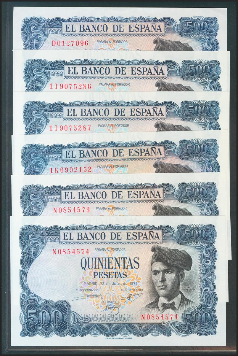 Conjunto de 6 billetes de 500 Pesetas emitidos el 23 de Julio de 1971, con las series D, N (pareja correlativa), 1I (pareja correlativa) y 1K (Edifil 2021: 473a), conservan su apresto original. SC/SC-.