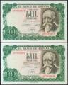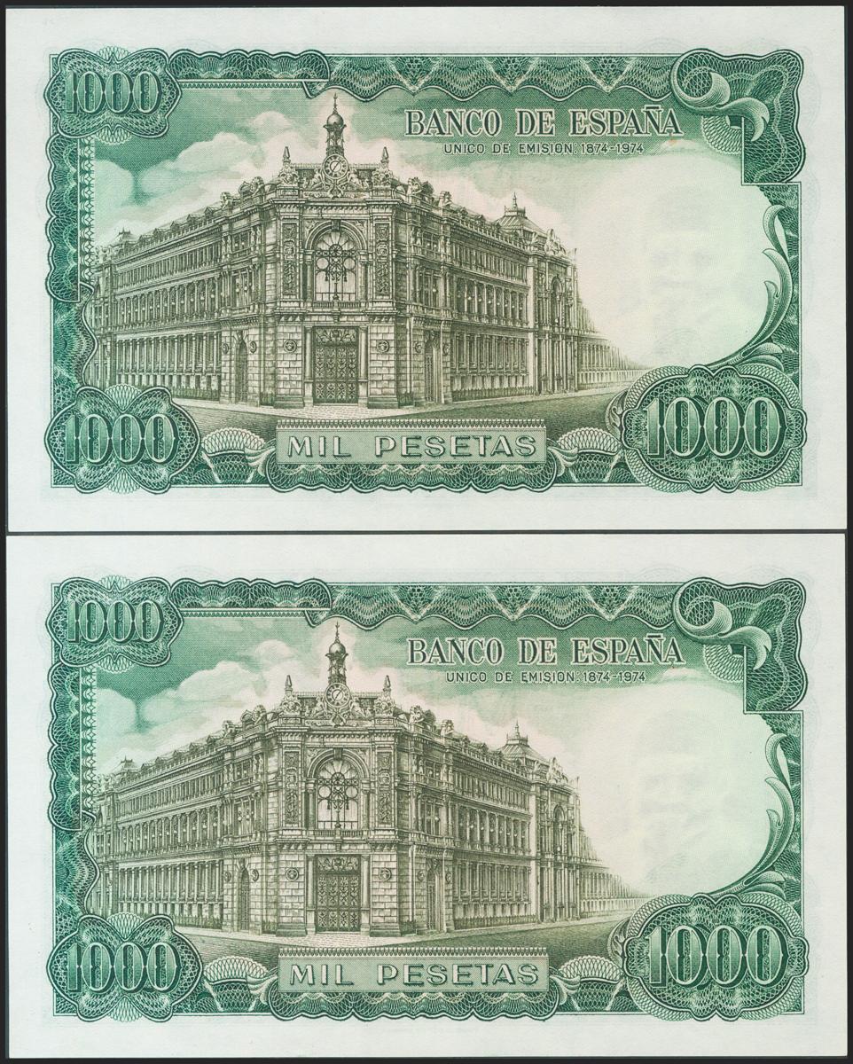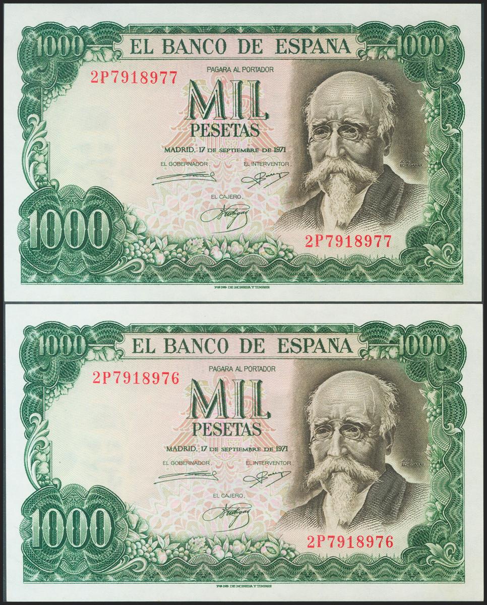 1000 Pesetas. 17 de Septiembre de 1971. Pareja correlativa. Serie 2P. (Edifil 2021: 474c). Conserva todo su apresto original. SC.