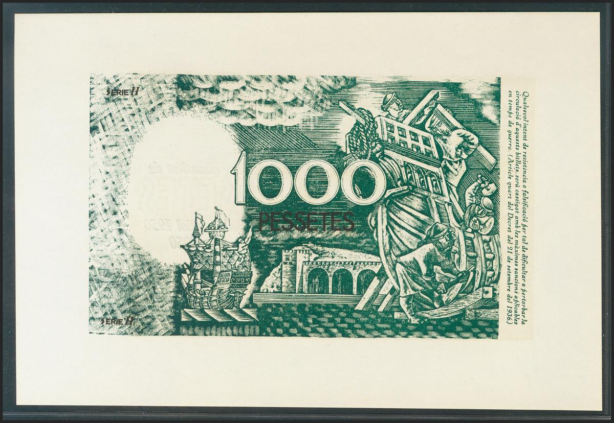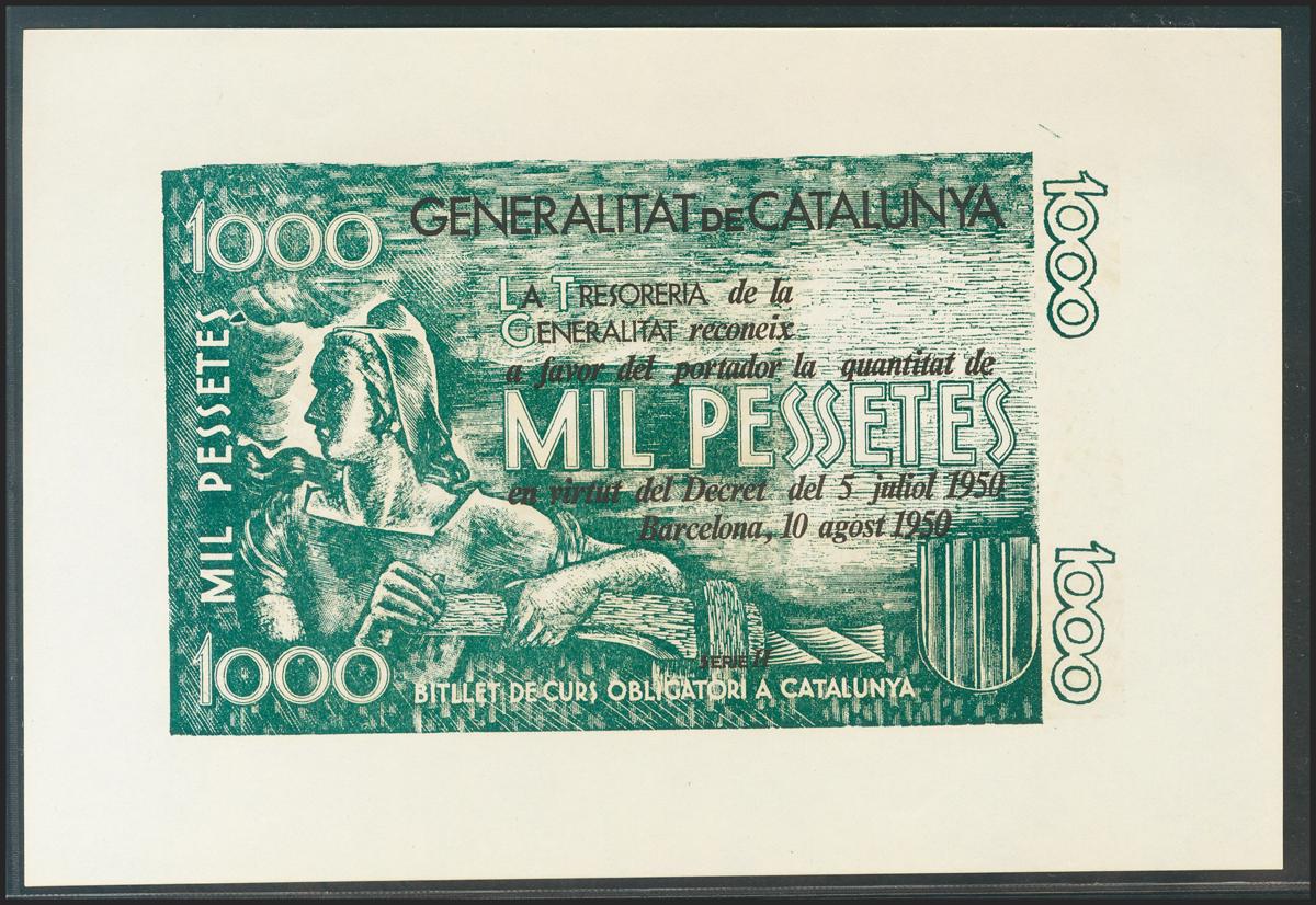 Prueba en color verde de un billete No Emitido de la Generalitat de Catalunya de 1000 Pesetas, emitido el 10 de Agosto de 1950, sin serie. (billete emitido privadamente, sin respaldo legal)