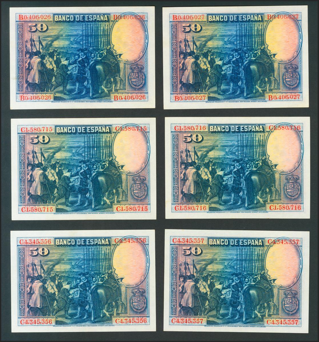 Conjunto del 50 Pesetas emitido el 15 de Agosto de 1928, una pareja correlativa con la serie B y dos parejas correlativas con la serie C, (Edifil 2021: 354), conserva su apresto original. SC/EBC+.