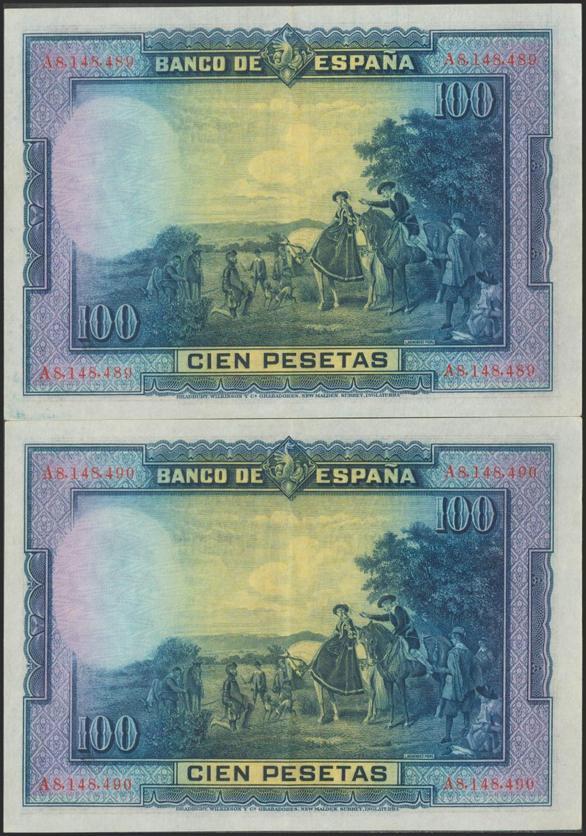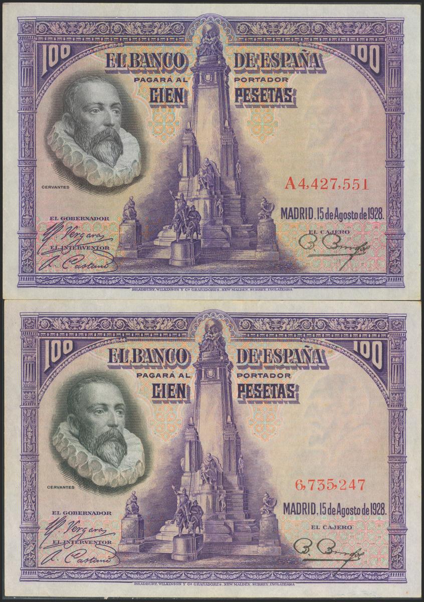 Conjunto de 2 billetes de 100 Pesetas emitidos el 15 de Agosto de 1928, sin serie y serie A, respectivamente. (Edifil 2021: 355, 355a), conservando parte del apresto original. EBC+.