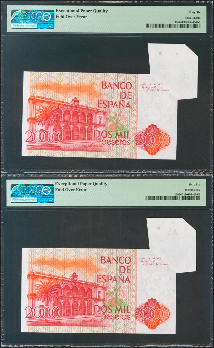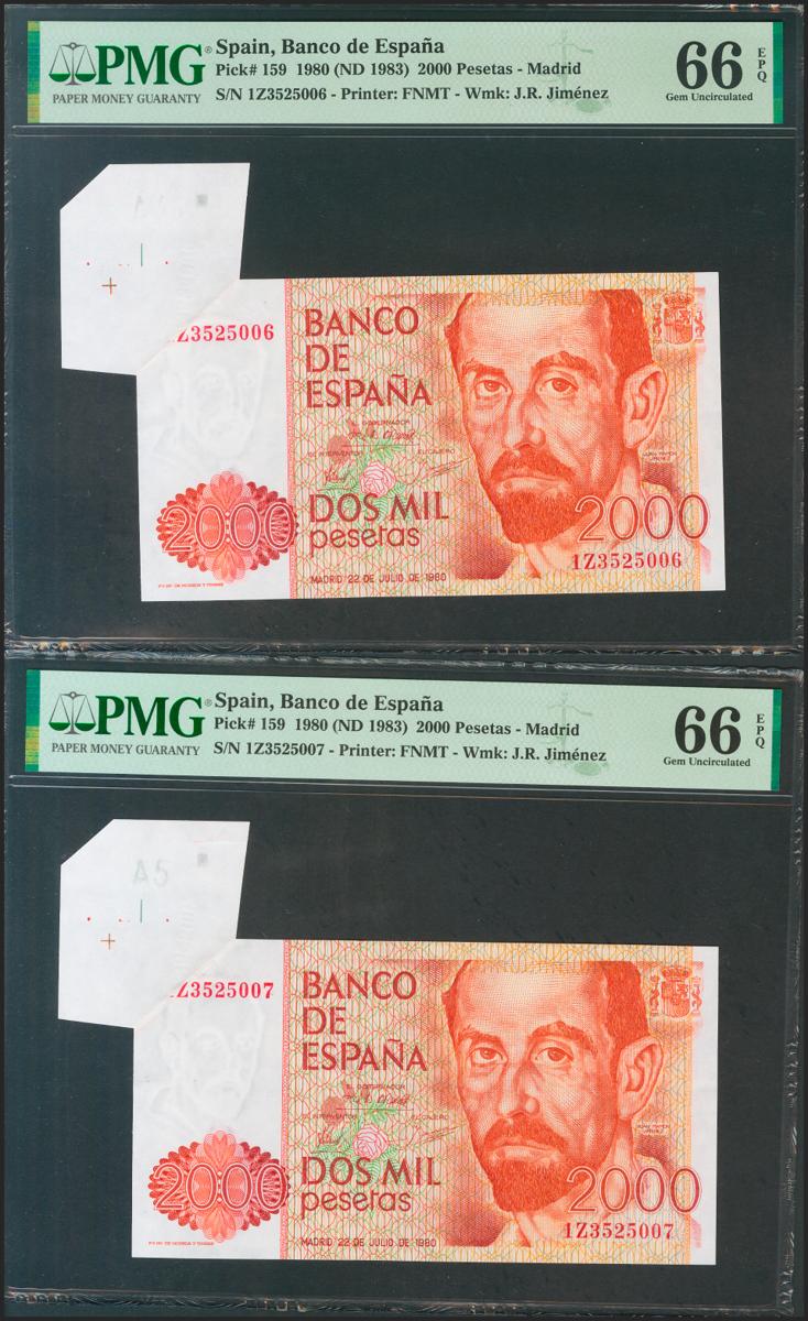 2000 Pesetas. 22 de Julio de 1980. Pareja correlativa. Error de guillotinado en la esquina superior izquierda. Serie Z. (Edifil 2021: 479a). Rarísima y espectacular pareja con error. SC. Encapsulados PMG66EPQ.