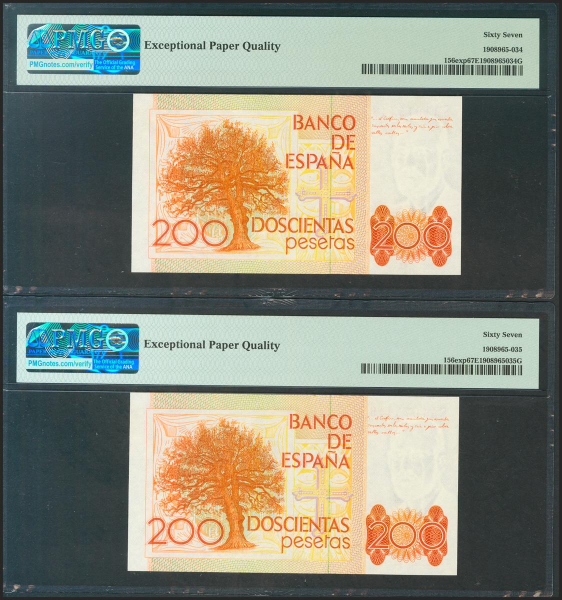 200 Pesetas. 16 de Septiembre de 1980. Pareja correlativa. Serie especial 8A. (Edifil 2021: 480c, Pick: 156exp). Rarísima en esta excepcional calidad, apresto original. SC. Encapsulado PMG67EPQ, ambos.