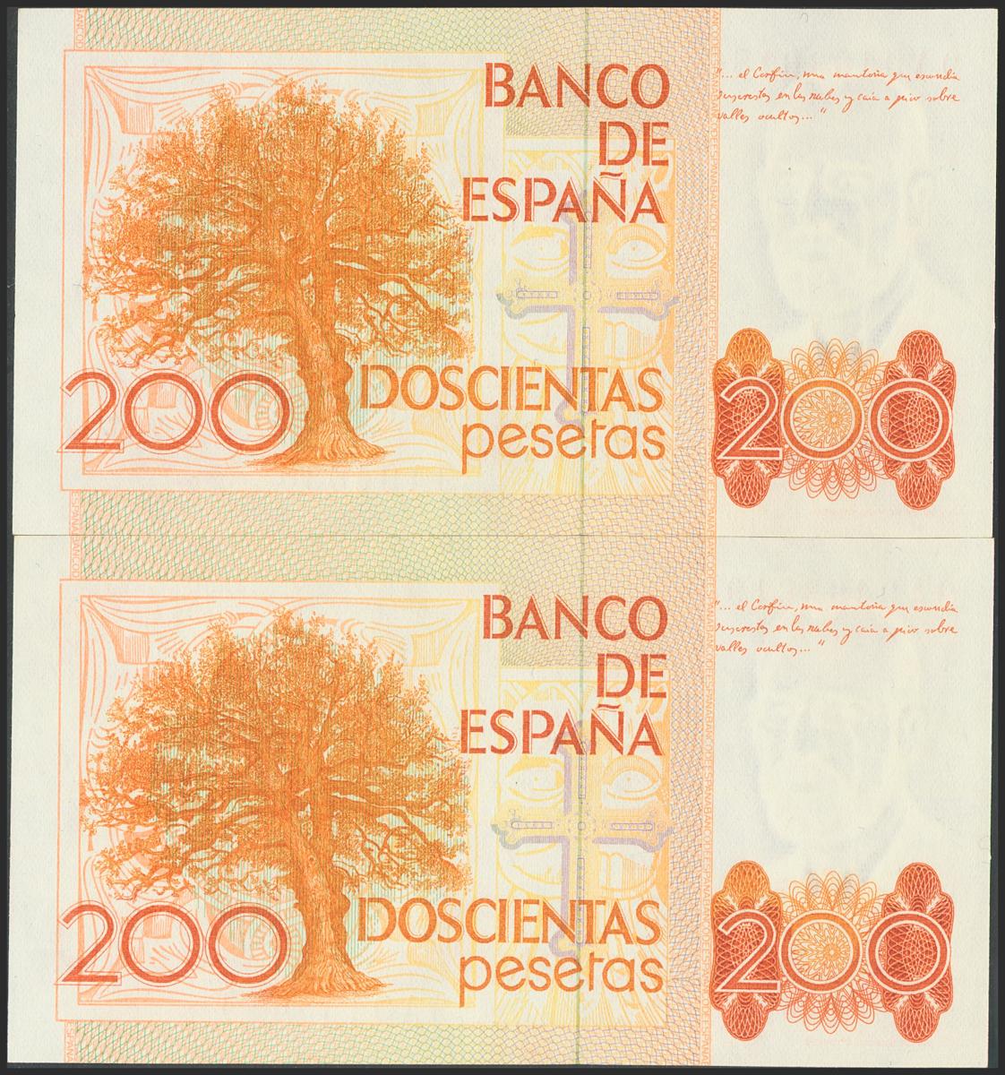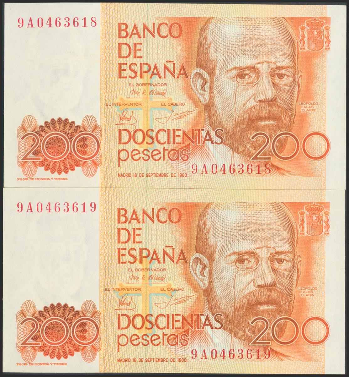 200 Pesetas. 16 de Septiembre de 1980. Pareja correlativa. Serie 9A. (Edifil 2017: 480b). SC.
