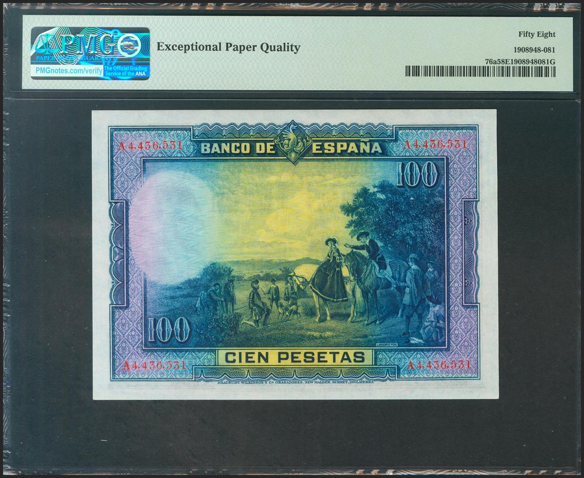 100 Pesetas. 15 de Agosto de 1928. Serie A. (Edifil 2021: 355a, Pick: 76a). Inusual en esta calidad y con apresto original. EBC+++. Encapsulado PMG58EPQ.