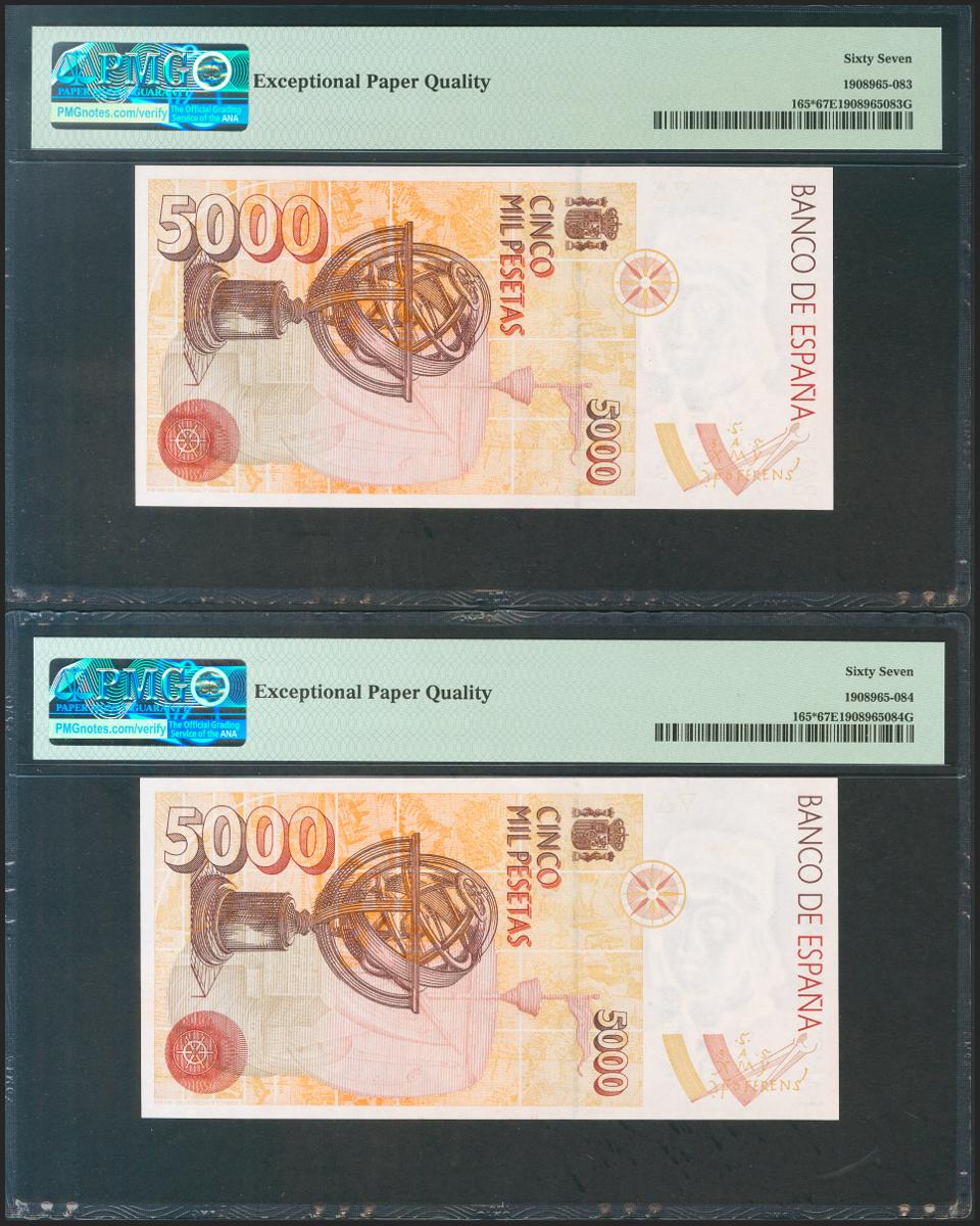 5000 Pesetas. 12 de Octubre de 1992. Pareja correlativa. Serie especial 9A. (Edifil 2021: 484b, Pick: 165*). Rarísima en esta excepcional calidad, apresto original. SC. Encapsulado PMG67EPQ, ambos.