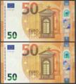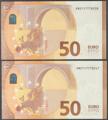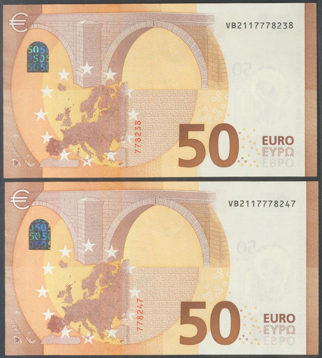 50 Euros. 4 de Abril de 2017. Pareja correlativa (cabe recordar que el último dígito de todos los billetes denominados en euros es para control interno del Banco Central Europeo, el que marca la correlatividad de los billetes es el penúltimo dígito). Firma Draghi. Serie V (España). (Edifil 2021: 496). SC.