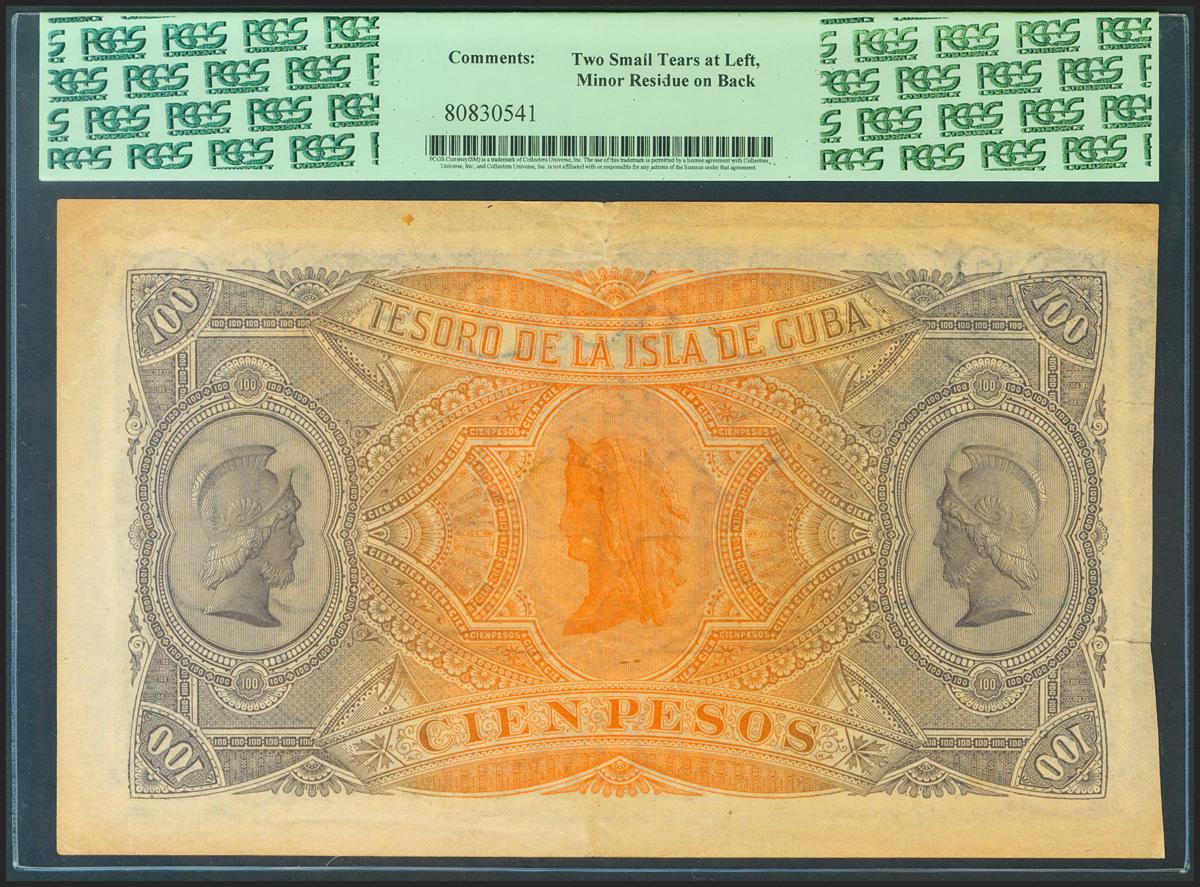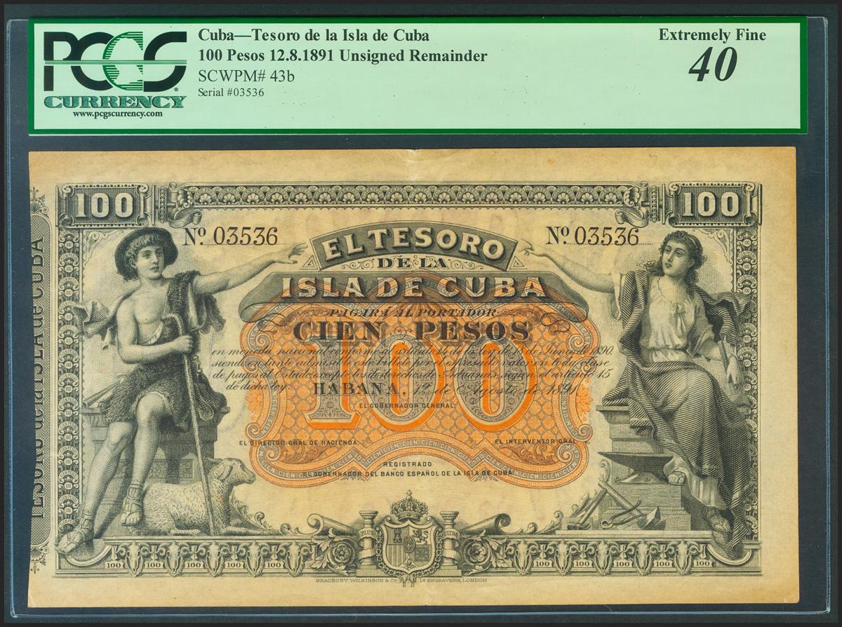 BANCO ESPAÑOL DE LA ISLA DE CUBA. 100 Pesos. 12 de Agosto de 1891. Sin serie y sin firmas como los ejemplares conocidos de esta emisión. (Edifil 2021: 67). Raro. EBC-. Encapsulado PCGS40.