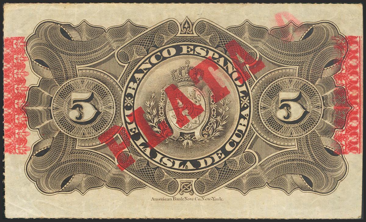 BANCO ESPAÑOL DE LA ISLA DE CUBA. 5 Pesos. 15 de Agosto de 1896. Sobrecarga PLATA. Serie F. (Edifil 2017: 81). MBC+.