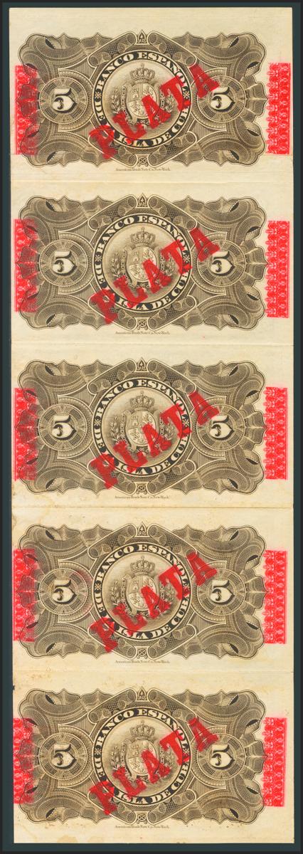 BANCO ESPAÑOL DE LA ISLA DE CUBA. 5 Pesos. 15 de Agosto de 1896. 5 billetes correlativos, sin guillotinar con sobrecarga PLATA, al dorso. (Edifil 2021: 81). Raro y apresto original. SC/SC-.