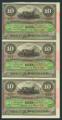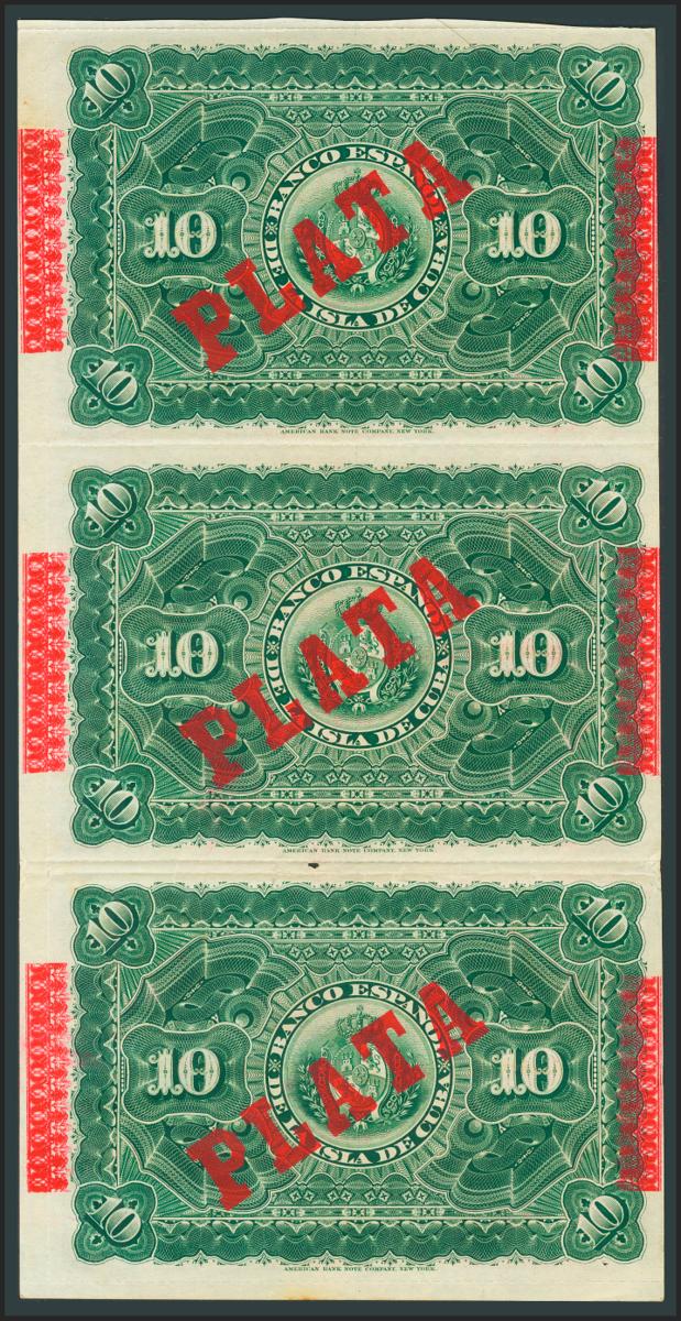 BANCO ESPAÑOL DE LA ISLA DE CUBA. 10 Pesos. 15 de Agosto de 1896. Trío correlativo. Serie E y sobrecarga PLATA, al dorso. (Edifil 2021: 82). Apresto original. SC/SC-.