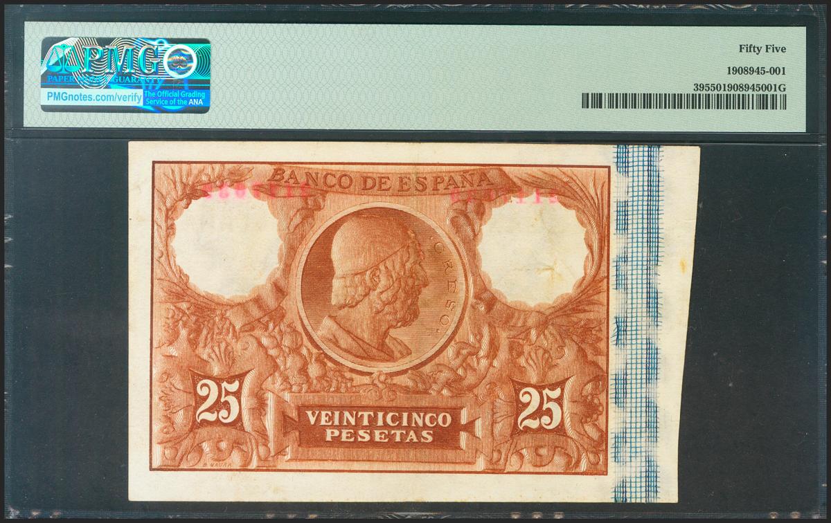 25 Pesetas. 1 de Junio de 1889. Serie A. (Edifil 2021: 297, Pick: 39). Rarísimo especialmente en esta excepcional calidad. EBC+. Encapsulado PMG55. (para hacernos idea de la rareza, a fecha 4 de Noviembre de 2021, este billete es el mejor calificado junto a otro billete en PMG).