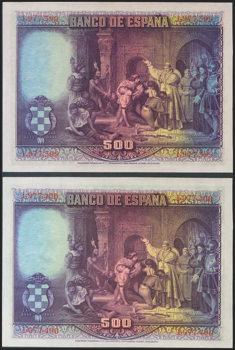 500 Pesetas. 15 de Agosto de 1928. Pareja correlativa. Sin serie. (Edifil 2021: 356). Conserva todo su apresto original, puntitos de grapa. SC-.