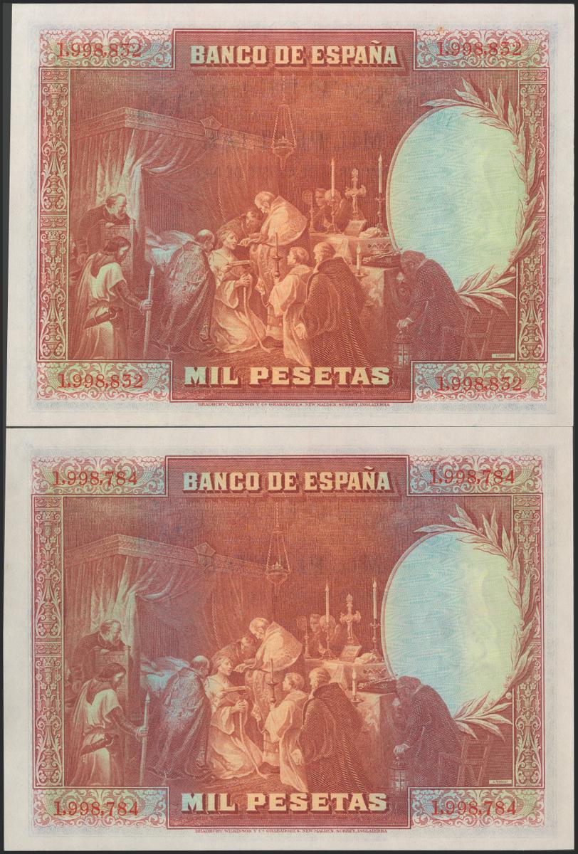 1000 Pesetas. 15 de Agosto de 1928. Pareja correlativa. Sin serie. (Edifil 2017: 357). Conserva todo su apresto original. SC.
