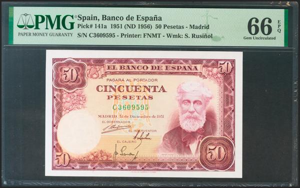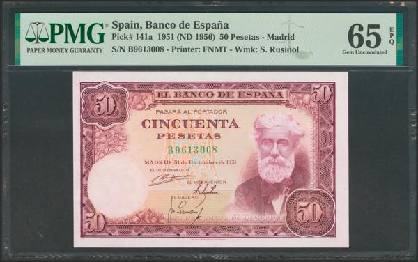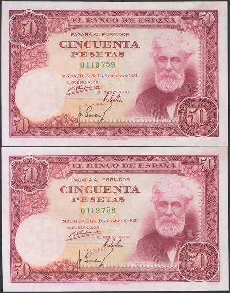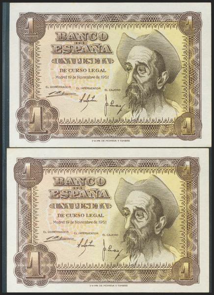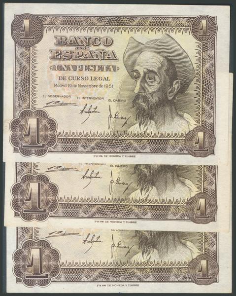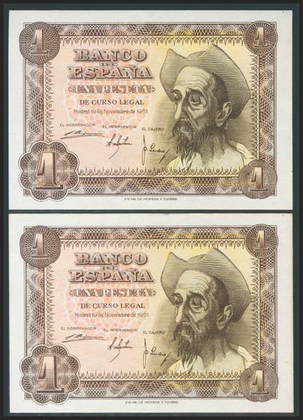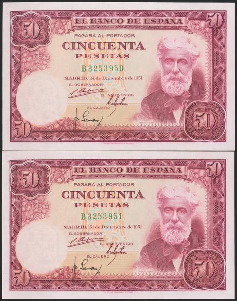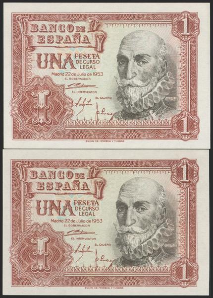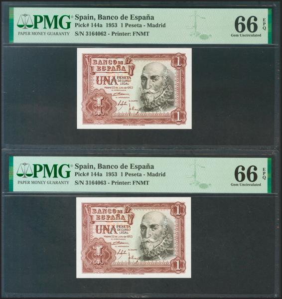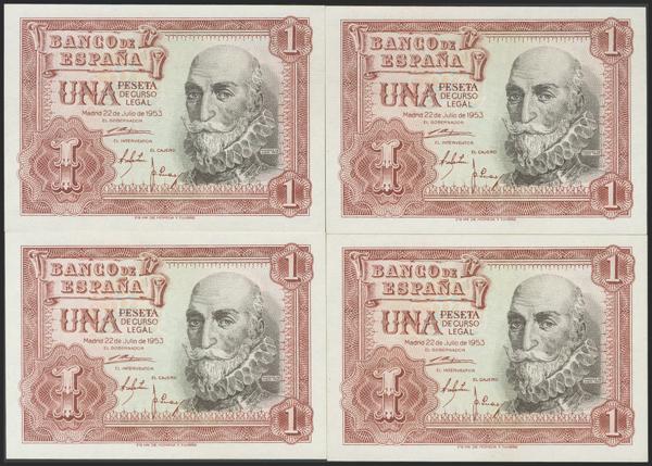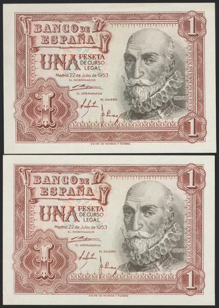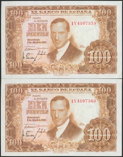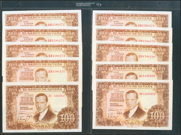 Precioso conjunto de 12 billetes de 100 Pesetas emitidos el 7 de Abril de 1953, incluyendo todas las letras de la serie inicial, a excepción de la D, E, F, G, H, J, K, Q, R, U, V, W, X, Z y sin el sin serie (A EBC, B EBC, C EBC-, I EBC, L EBC+, M EBC+, N EBC+, P EBC-, EBC-, T MBC+, X EBC+, Y EBC+). (Edifil 2021: 464, 464a). Inusual conjunto.