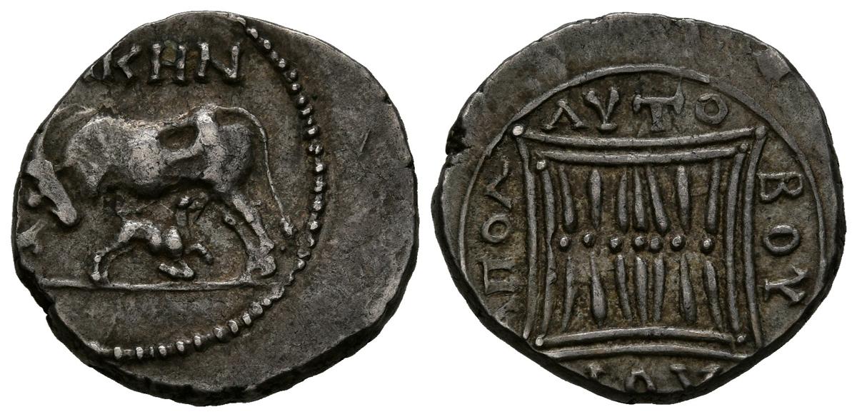 ILLYRA, Apolonia. Dracma. (Ar. 3,64g/18mm). 229-100 a.C. (HGC 3.1, 4). Anv: Vaca mirando a derecha alimentando a ternero, encima leyenda griega. Rev: Dos estrellas dentro de grafila cuadrada, alrededor leyenda griega. MBC+. Precioso ejemplar.
