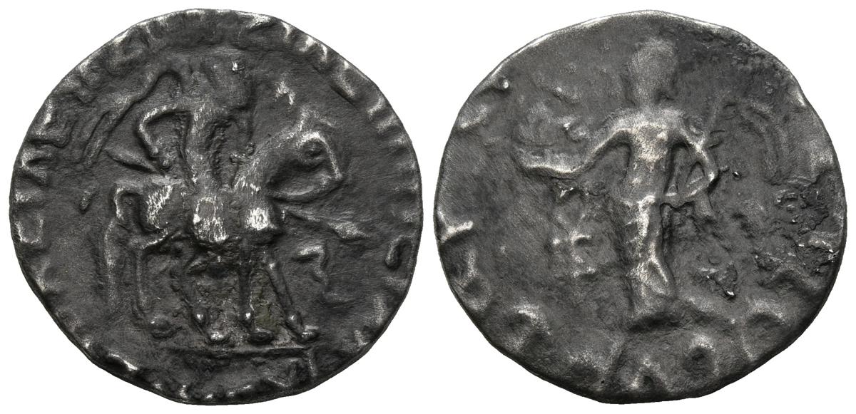 INDOESCITAS, Azilizes. Tetradracma. (Ar. 6,90g/20mm). 85-45 a.C. (HGC 12, 568). Anv: Azilizes sobre caballo con lanza y látigo a derecha, delante símbolo, alrededor leyenda. Rev: Diosa de la ciudad estante a izquierda portando brasero y palma, entre símbolos, alrededor leyenda. MBC-.