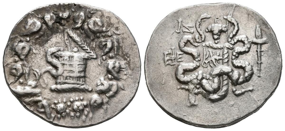 JONIA, Efesos. Cistóforo. (Ar. 12,75g/28mm). 118-117 a.C. (SNG von Aulock 321 var). Anv: Cista mística con una serpiente, rodeada de corona de yedra. Rev: Dos serpientes entrelazadas alrededor de carcaj y arco, encima racimo de uvas, a la izquierda monogramas griegos y a la derecha antorcha. MBC+.