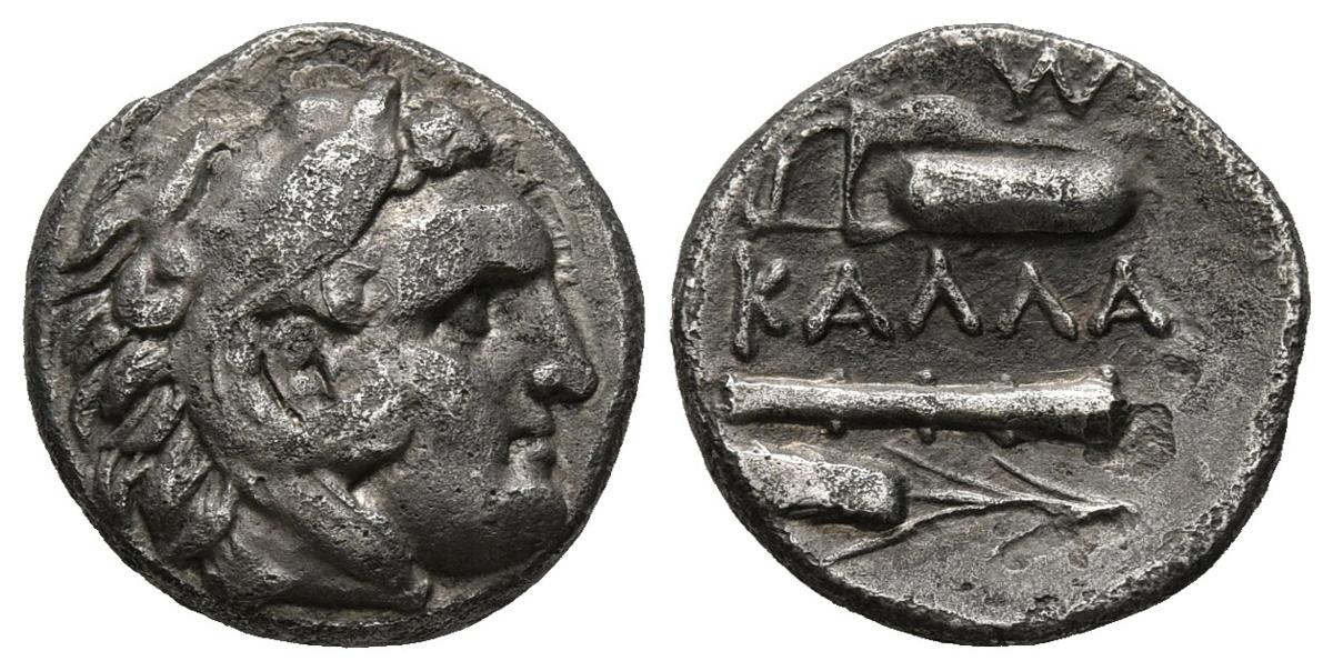 MOESIA, Kallatis. Tetróbolo. (Ar. 2,33g/15mm). 300-200 a.C. (Seaby 1660). Anv: Cabeza de Alejandro III con piel de león a derecha. Rev: Carcaj con arco, debajo clava y espiga, entre ellos leyenda griega, en campo W. EBC-. Bonito ejemplar.