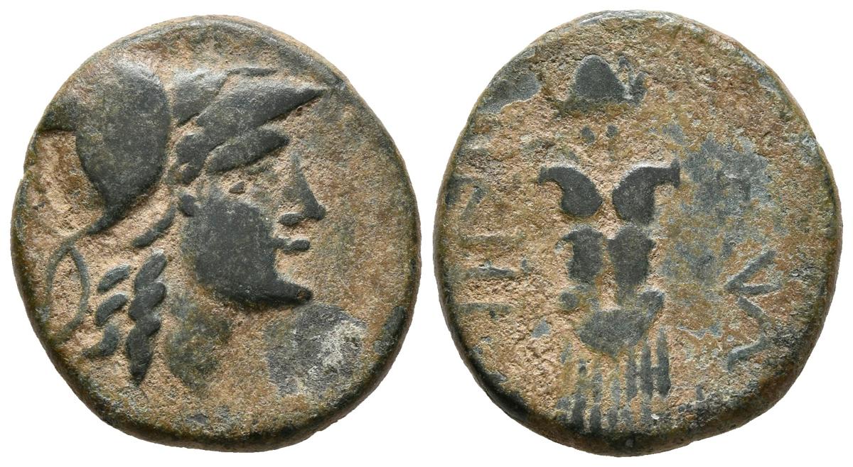 PERGAMO, Misia. Ae21. (Ae. 6,36g/21mm). 200-133 d.C. (SNG Paris 1875). Anv: Cabeza de Atenas a derecha. Rev: Trofeo compuesto por casco y coraza, alrededor leyenda griega. MBC.