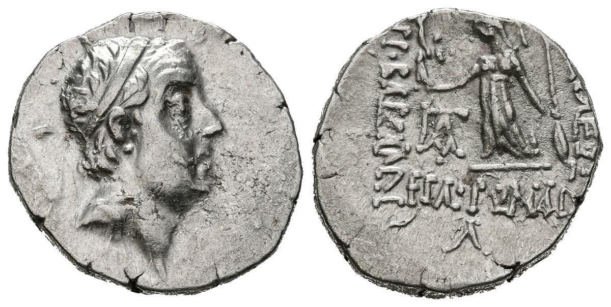 REYES DE CAPADOCIA, Ariobarzanes I. Dracma. (Ar. 3,95g/17mm). RY30 (66 a.C). (Simonetta 44a; HGC 7, 846). Anv: Cabeza laureada de Ariobarzanes I a derecha. Rev: Atenas estante a izquierda portando Nike con corona de laurel y lanza, delante monograma griego, alrededor leyenda griega. MBC+.