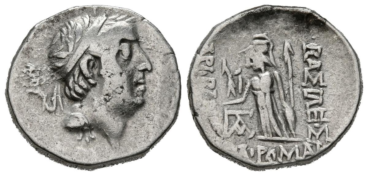 REYES DE CAPADOCIA, Ariobarzanes I. Dracma. (Ar. 4,35g/17mm). RY30 (66 a.C). (Simonetta 56; HGC 7, 846). Anv: Cabeza laureada de Ariobarzanes I a derecha. Rev: Atenas estante a izquierda portando Nike con corona de laurel y lanza, delante monograma griego, alrededor leyenda griega. MBC-.