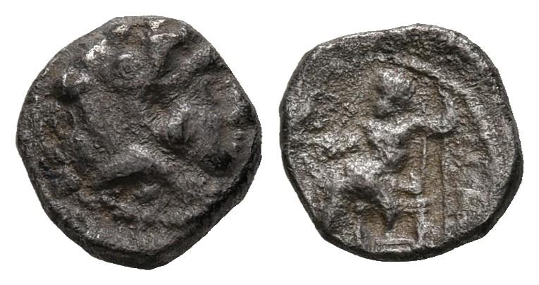 REYES DE MACEDONIA, Alejandro III el Grande. Obolo. (Ar. 0,60g/9mm). 336-323 a.C. (Seaby 6736). Anv: Cabeza de Alejandro III con piel de león a derecha. Rev: Zeus sentado a izquierda portando cetro, detrás leyenda griega. MBC-.